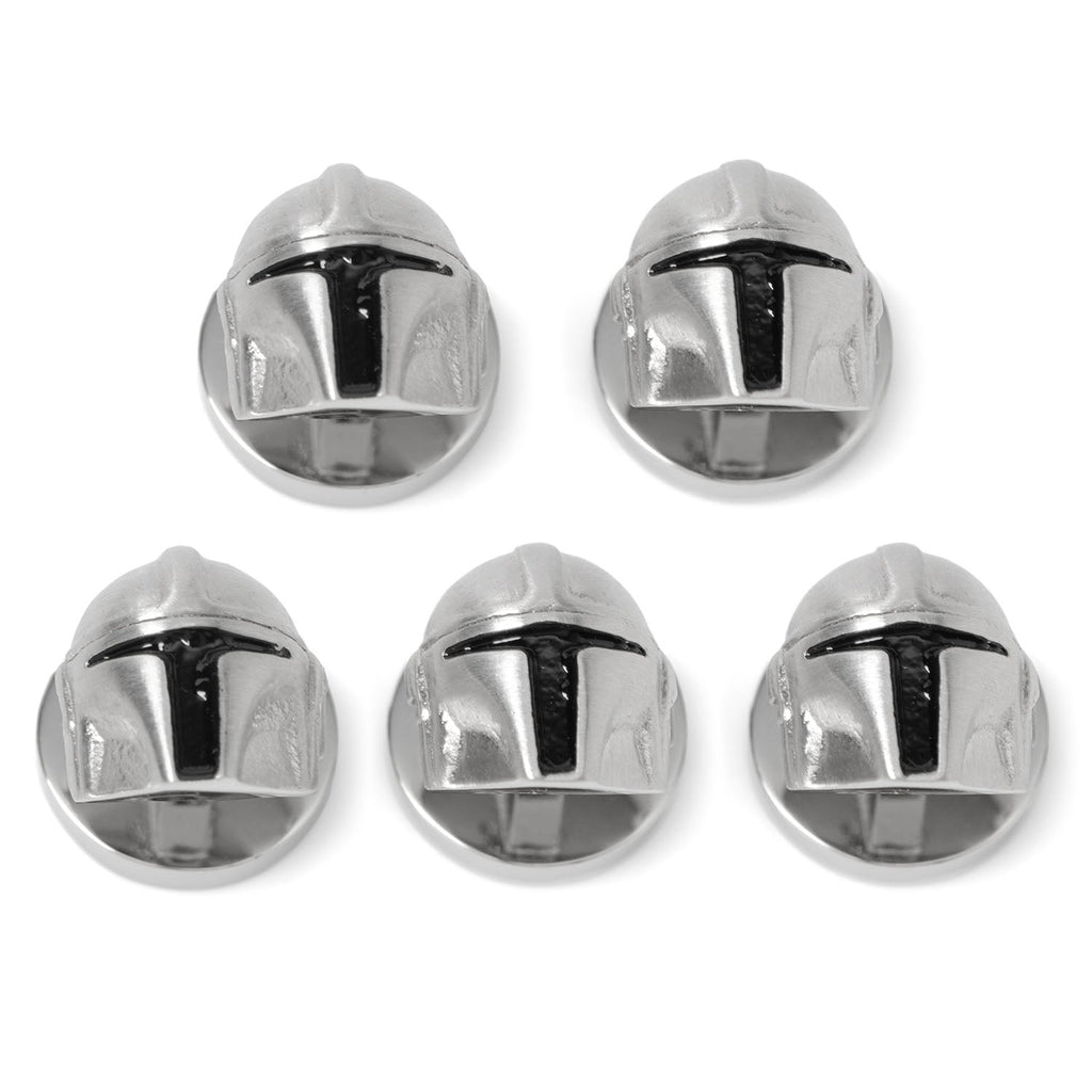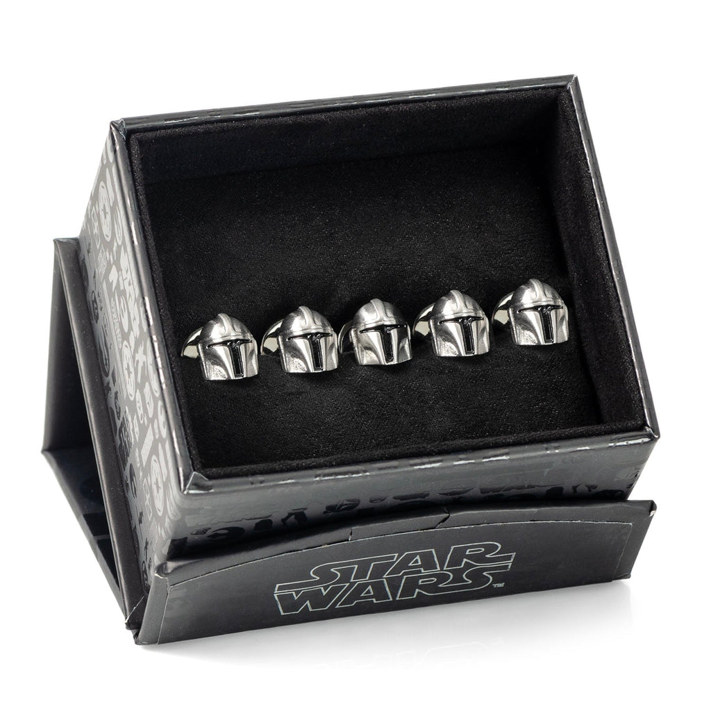 Since members of the Mandalorian guild never take off their helmets, we figured they deserved a tribute. This set of 3D studs feature Mando's helmet set in shiny silver. Black detailing adds dimension to the aesthetic of the cufflink. The fixed backing features a debossed mythosaur skull on the reverse side. Experience the Way of the Mandalore with our expertly crafted Stainless Steel studs. They are built to withstand the challenges of bounty hunting across the galaxy, infused with the honor of Mandalorian creed, and ready to accompany you on interstellar hunts. Pairs perfectly with our 3D Mandalorian Cufflinks. Officially licensed by LucasFilm LTD.