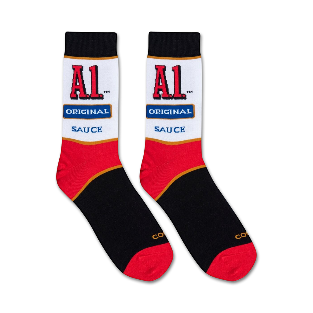 These A1 Steak Sauce socks are sure to be your new favorite! Get saucy with this stylish and condiment-inspired design featuring red and white stripes at the toe and heel, bold black accents, and the iconic A1 Original Sauce logo on a white background. Add some flavor to your feet and show the world you're as unique as the steak sauce you put on your plate.