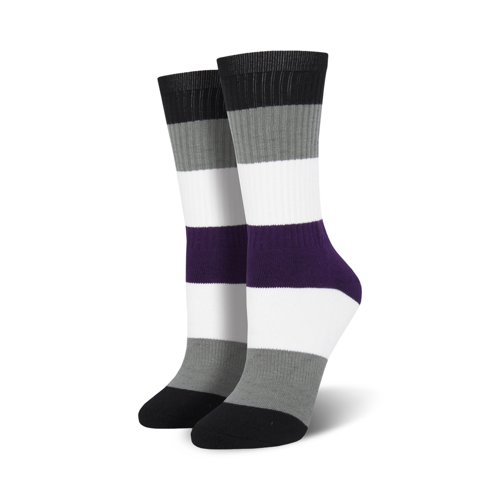 You'll be the ace of the party with these colorful socks featuring four stripes in black, grey, purple, and white. Perfect for showing off your pride in style whether you're hanging out with friends or just kicking back at home, these crew length socks are sure to turn heads and make you smile. Plus, they're suitable for both men and women, so everyone can get in on the fun.