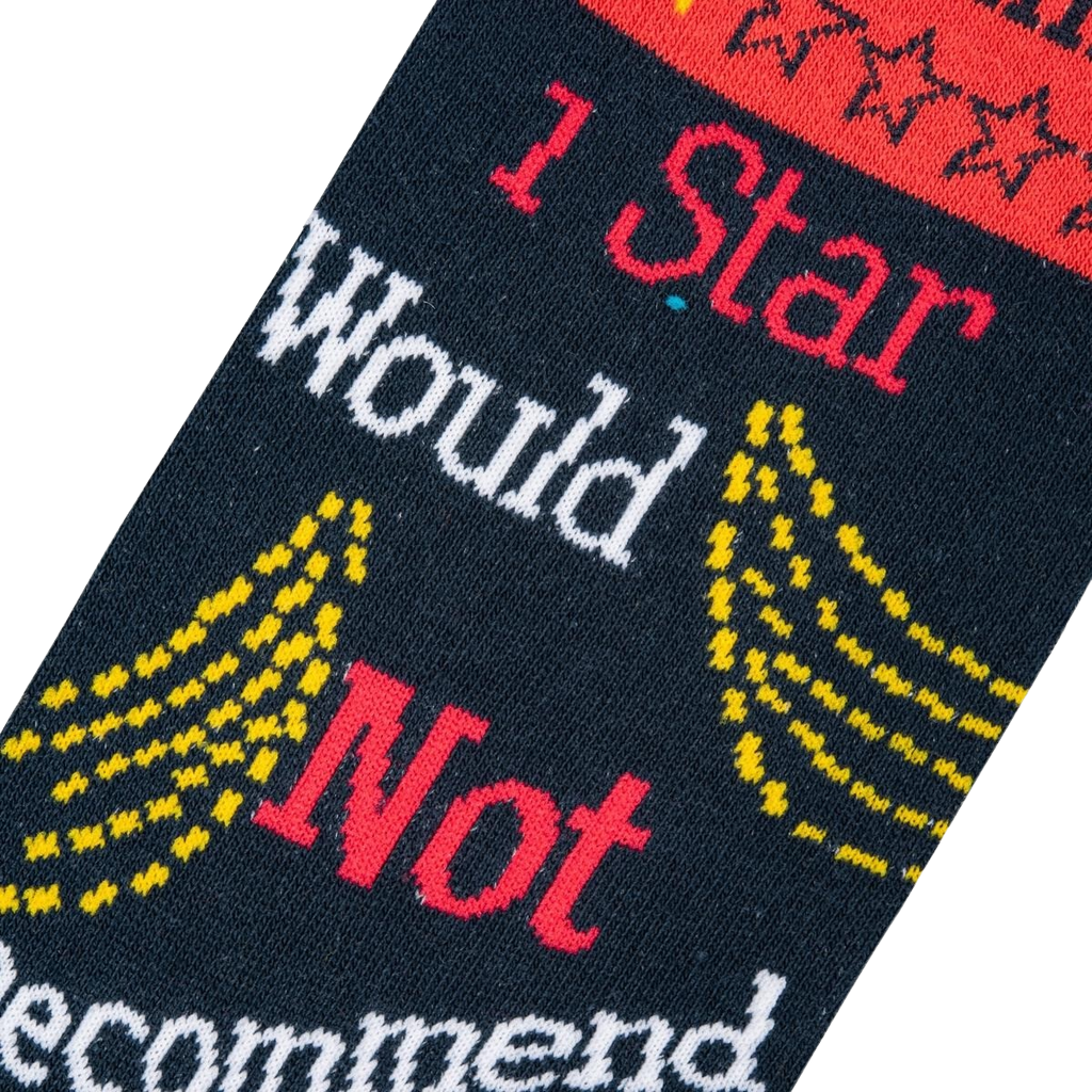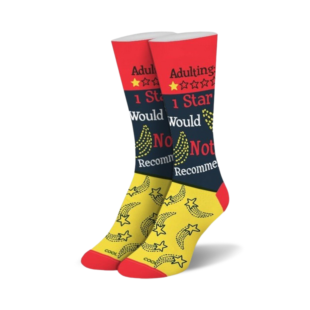 Wrap your ankles in a bold declaration of rebellion against the humdrum of adulthood! These red and black crew socks, speckled with defiant yellow stars, sport the ultimate cheeky review: "Adulting: 1 Star, Would Not Recommend". Perfect for those days when you're not here for adult responsibilities and your feet speak your mood.