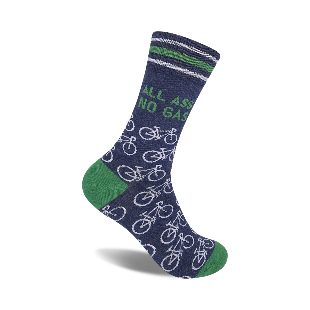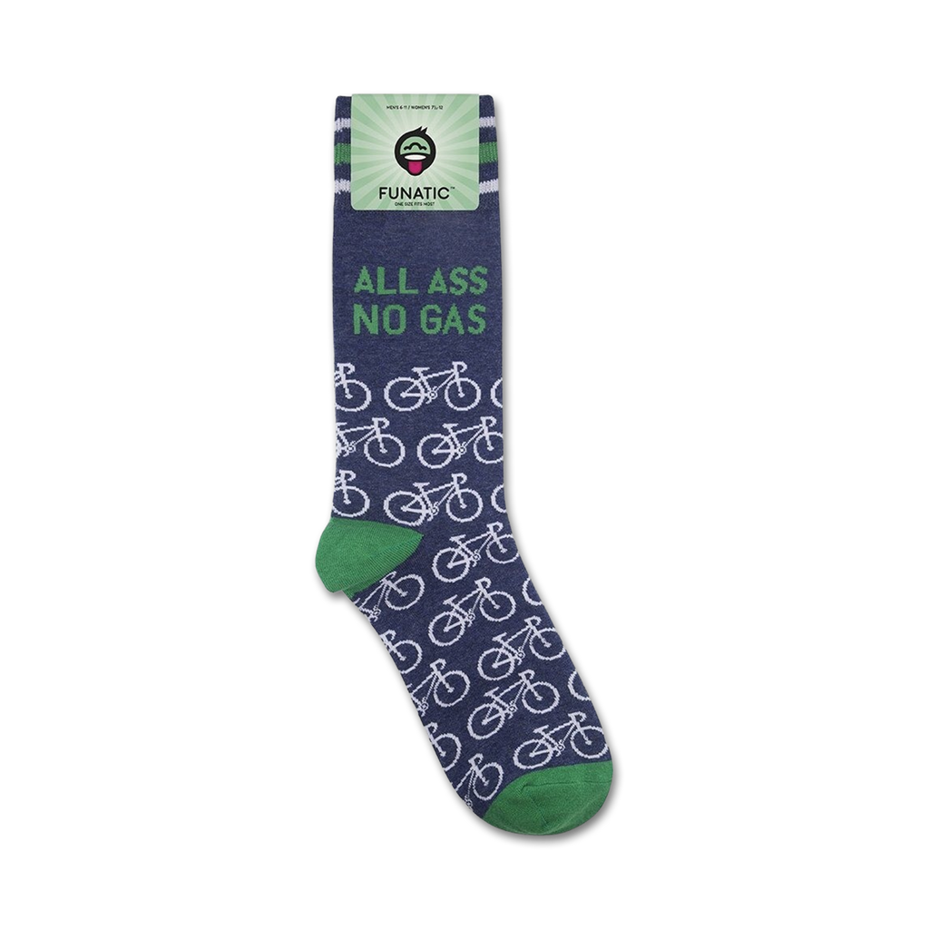 Pedal to the metal with All Ass, No Gas socks! These sky blue crew socks are covered in white bicycles and let everyone know you're all about that cycling life. These mens bike socks feature green toes, heels, and cuffs with "ALL ASS NO GAS" written across the top in bold green letters. Your feet will thank you for these comfy cotton blend socks with reinforced heels and toes, and people will thank you for the laughs.