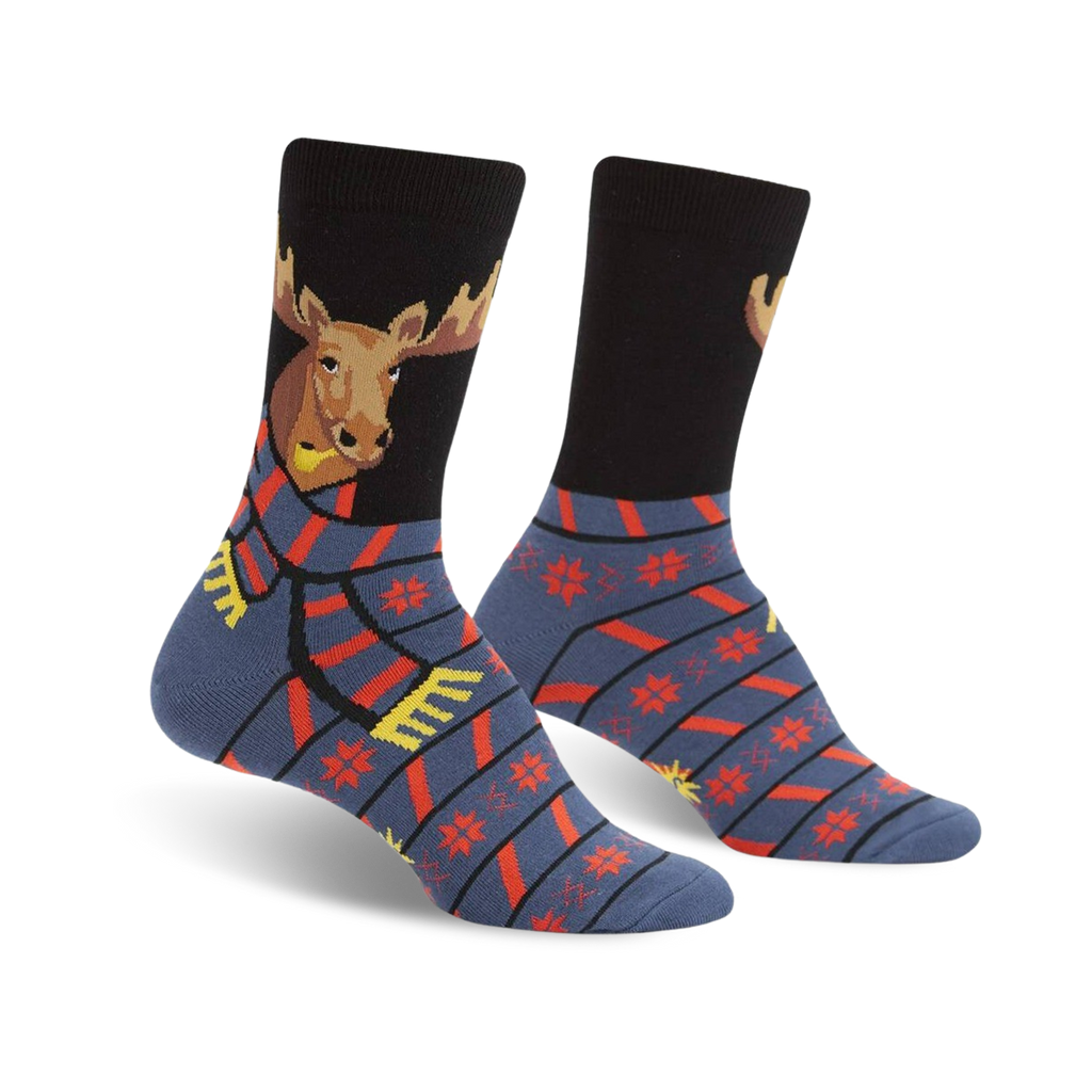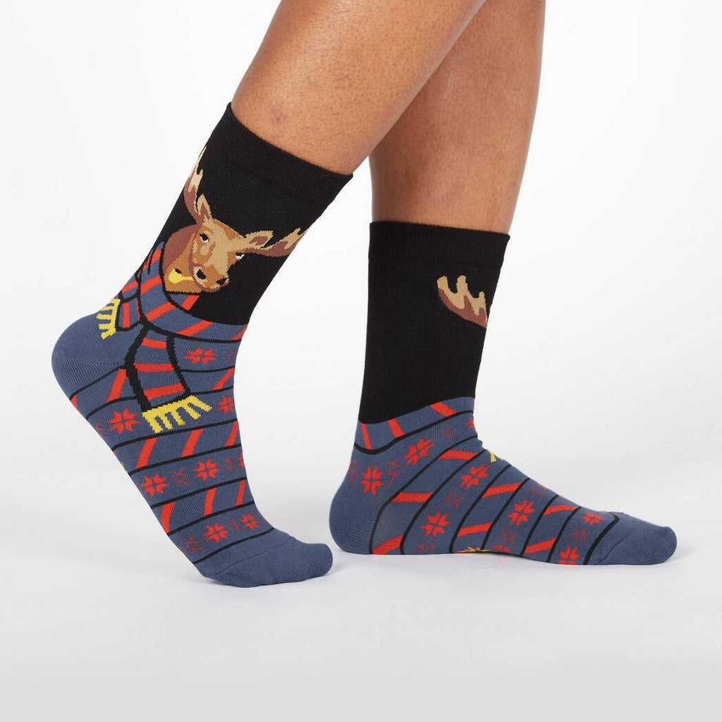 A cool pair of novelty socks to keep your feet looking festive and fuzzy during the winter months. These cozy crew socks for women are made with a blend of soft, warm materials. The moose design is sure to bring a smile to your face and brighten up your cold weather wardrobe.