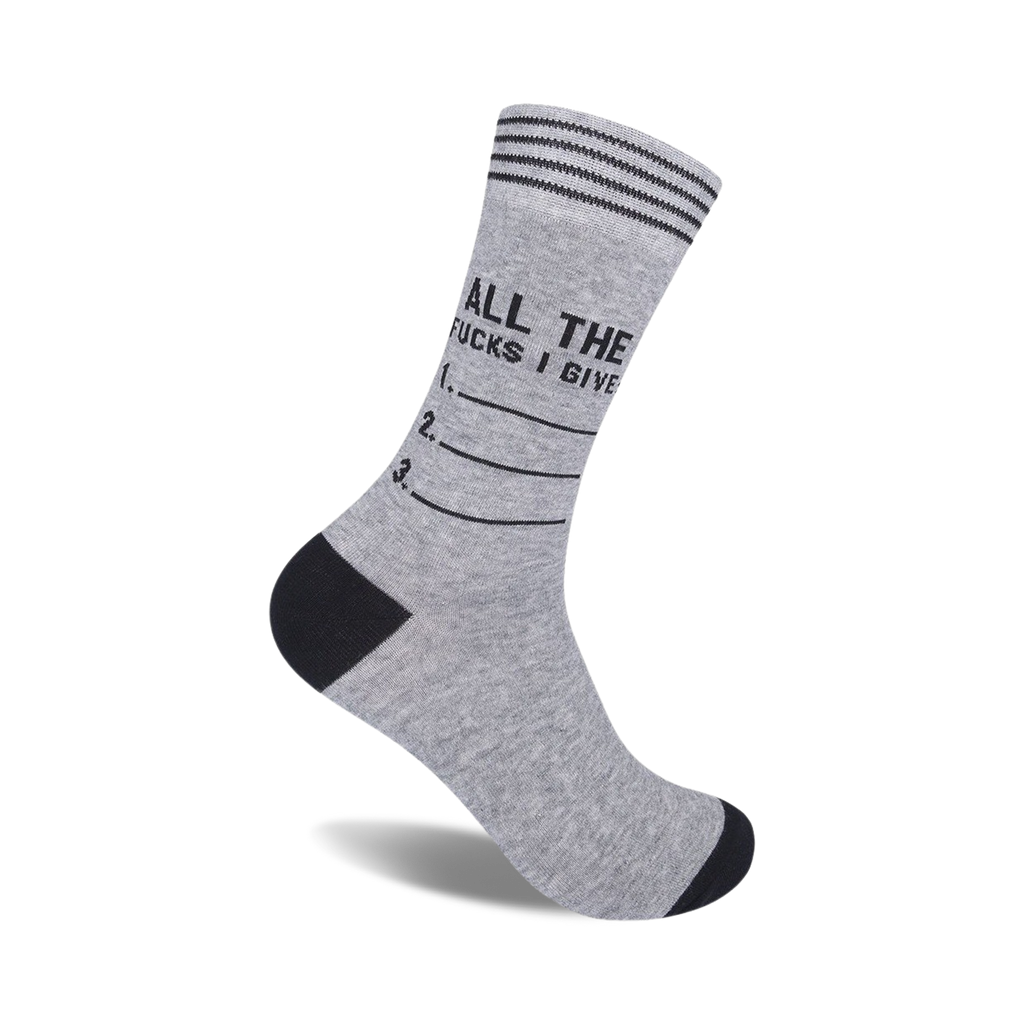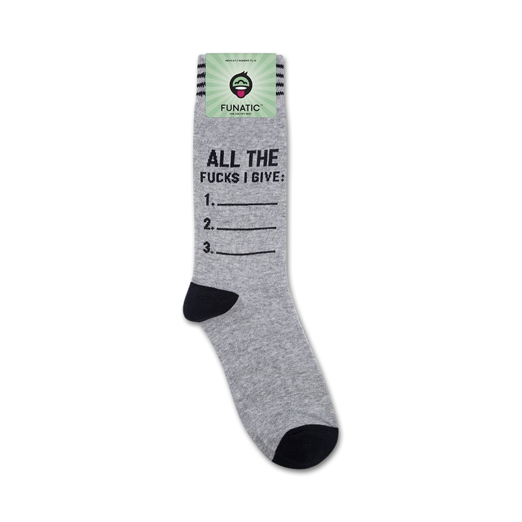Get ready to elevate your sock game with All The Fucks I Give socks! Forget about boring old socks - these sassy crew socks are all about fun and expressing yourself. With their bold black text against a sleek gray background and three empty lines below, it's like you're making a list of all the cares you don't have. Show off your carefree attitude and let your feet do the talking. Whether you're a man or a woman, these unisex socks are perfect for anyone who loves to have a little cheeky fun.