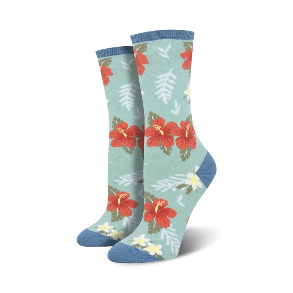 Longing to put your feet in that warm, powdery white sand? Well, these awesome Hawaiian-themed socks will transport you to the serene islands of paradise. These cool pair of these women's crew socks feature lovely plumerias and hibiscuses floating around on a dark blue background. When you slip on these fun socks, your feet will say "Mahalo"!