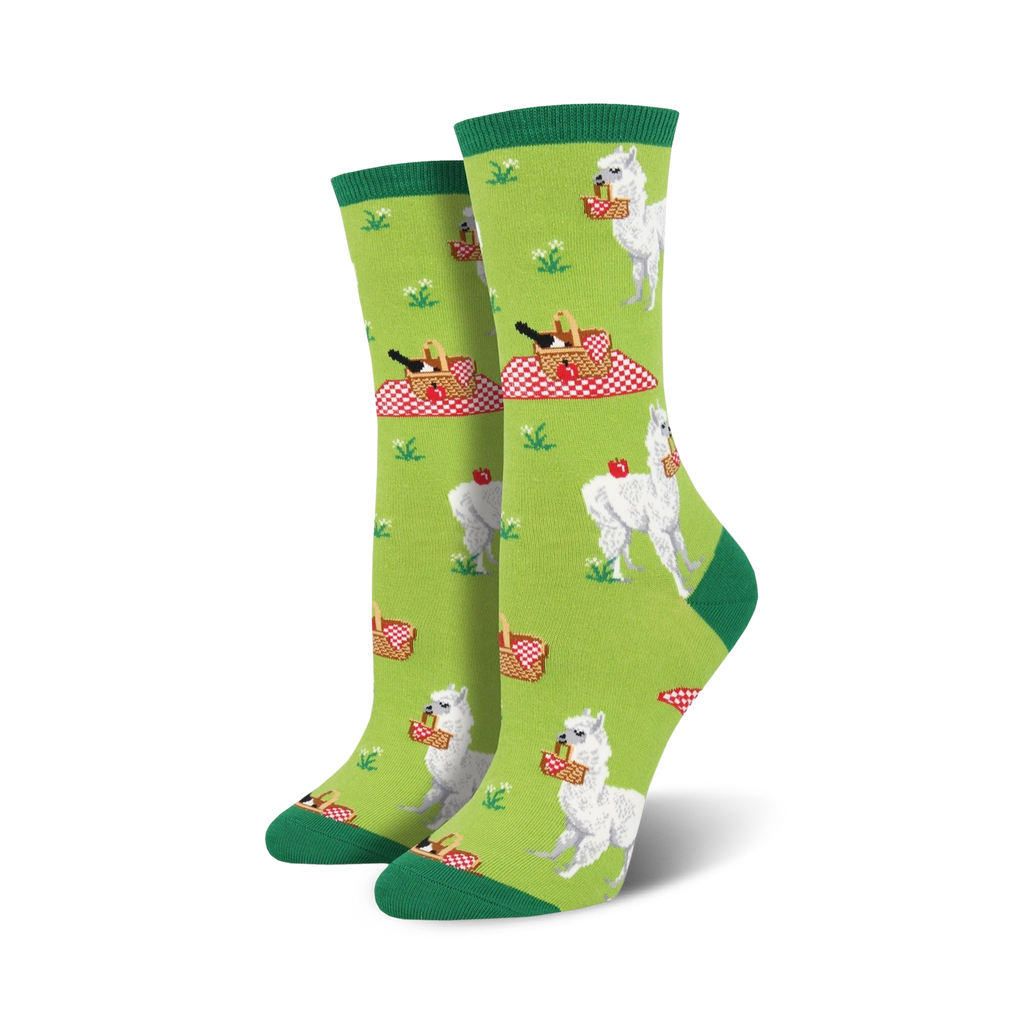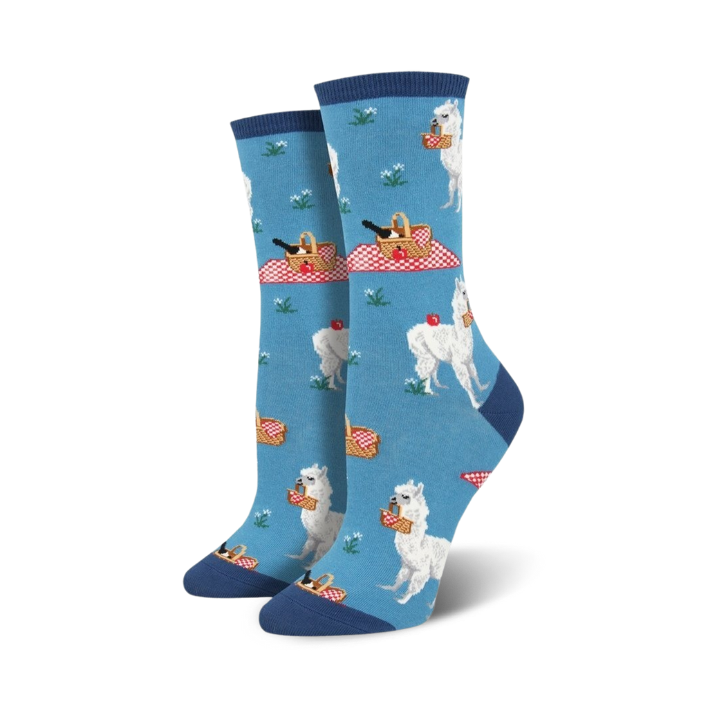 There's nothing cuter than an alpaca who will pack a lunch for you! These cool, funny socks would make the perfect gift for any alpaca lover. Each adorable pair of women's crew features white alpacas and picnic baskets printed all over on a pleasant blue background. Life is a picnic, especially when you've got some fluffy, cute alpacas to keep you company.