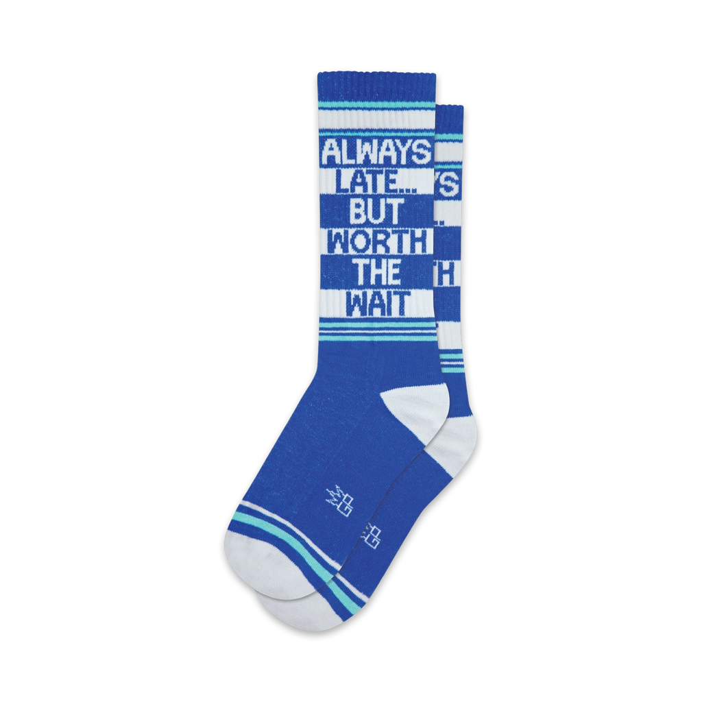 Who says gym socks can't be fun and funky? These Always Late... But Worth The Wait Gym Socks are the epitome of quirky. Featuring striking blue and white stripes and bold white text that says "Always Late...But Worth the Wait," these socks are bound to elicit chuckles and curious glances at the gym. Like a fine wine, you may be fashionably late, but it will be worth the wait when you arrive rocking these babies. Crafted for both men and women, these crew-length socks will keep your feet comfy and stylish. So, if punctuality isn't your forte but you're fabulous regardless, add some humor to your workout wardrobe with these witty socks.