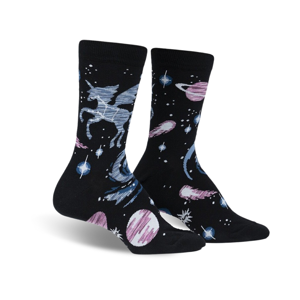 Introducing our celestial chic crew socks, where your feet take flight on a cosmic journey! These aren't just any old socks—they're a constellation of style, featuring a playful parade of Pegasus, twinkling stars, distant planets, and zipping comets against a sleek black backdrop. Slip into these socks and let your imagination soar beyond the stratosphere. Whether you're stargazing from the comfort of your couch or strutting your stuff on the streets, these socks are sure to add a touch of intergalactic charm to any ensemble. So, why settle for ordinary when you can elevate your sock game to astronomical heights?