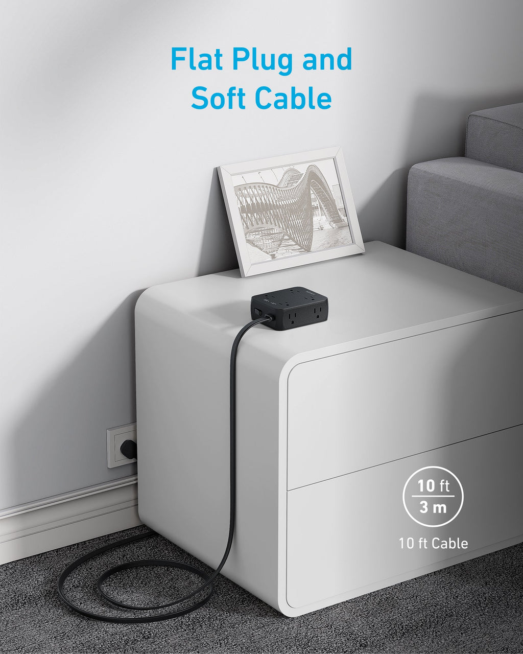 Efficient Design, Extended Reach: Optimize your charging setup thanks to the compact design, featuring outlets on three sides, a thin 5 ft cord, and a 45° flat plug for convenient, unobtrusive power access.