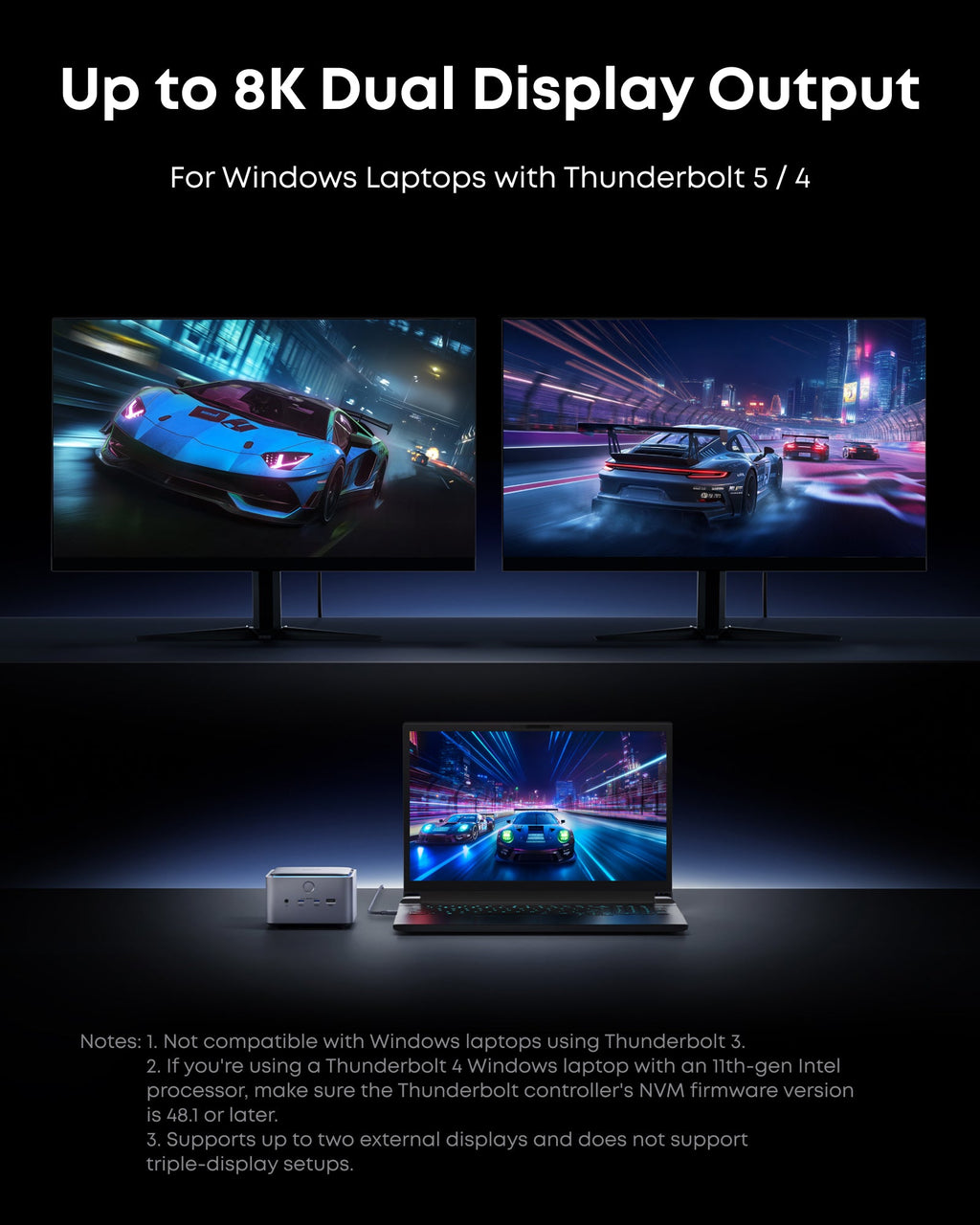 - Dual Display Docking Station: Supports one HDMI or DisplayPort and two Thunderbolt 5 downstream video outputs. Delivers up to 8K@60Hz for a single display, or dual 8K@60Hz for Thunderbolt 5 Windows laptops.