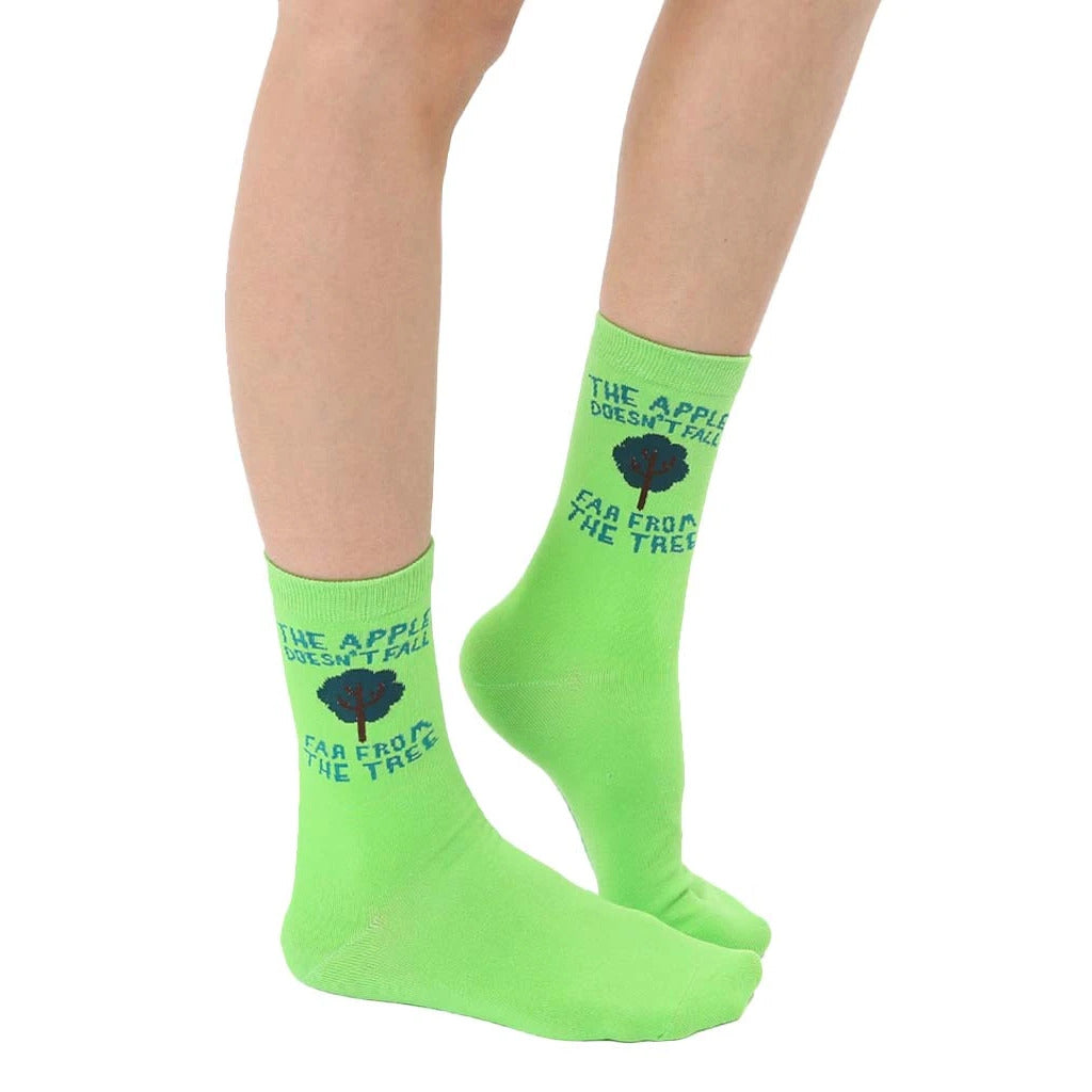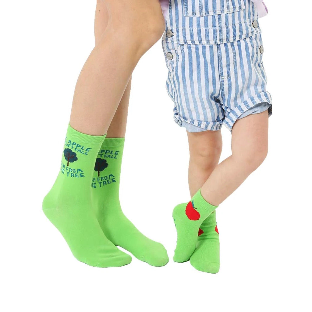 Dive into the vibrant world of Apple Me And Mini socks with their irresist-apple design! Imagine a delightful blend of Granny Smith hues and a bright red apple accented with a mischievously wiggling worm - a playful twist on the age-old saying, "An apple never falls far from the tree." Feel the cushiony comfort of these unisex crew socks as you step into a world of quirky charm and witty wordplay. They're like an orchard of happiness for your feet! Show off your unique taste with a dash of fruity fun, whether you're a kid, woman, or man. Suitable even for the fussiest of toes!