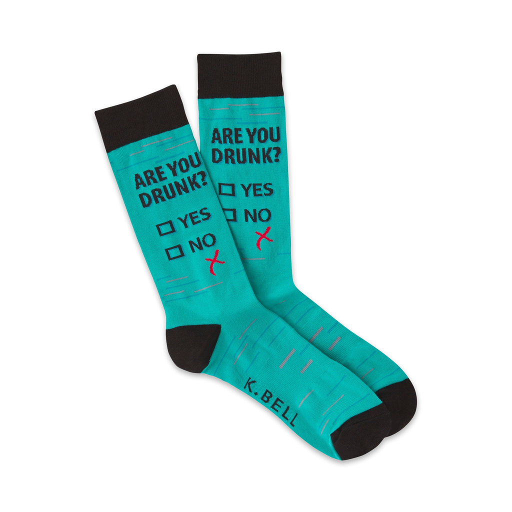Test your levels of sobriety by simply checking off the correct box! Well, this certainly isn't going to plan. Show off your drunken sense of humor with these silly socks. Each cool pair of black and green crew socks features the question "Are you drunk?" with check boxes beneath it. We'd say the answer is yes!