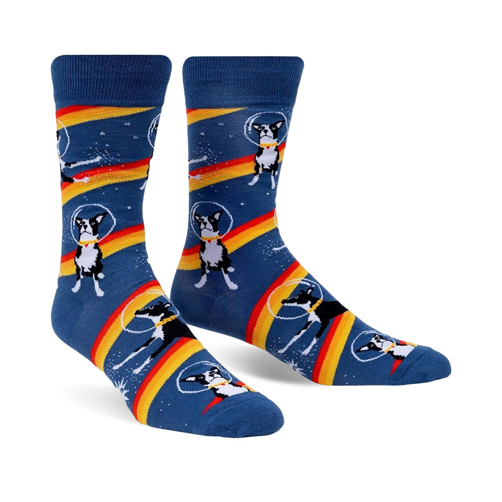 Space Doggos! Take a journey to the final frontier with these Astro Puppy Crew Socks! Featuring an adorable pattern of doggo cosmonauts soaring through space with planets, stars, and sparkling constellations, these out-of-this-world kicks are the perfect accessory for any space cadet's wardrobe. Jump aboard this cosmic canine crew and let your feet boldly go where no foot has gone before.