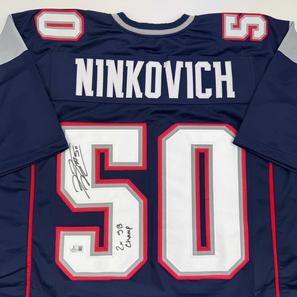 Autographed/Signed Rob Ninkovich "2x SB Champ" New England Blue Football Jersey Beckett BAS COA