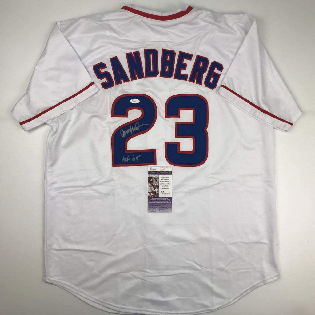 Autographed/Signed Ryne Sandberg HOF 05 Chicago White Baseball Jersey JSA COA