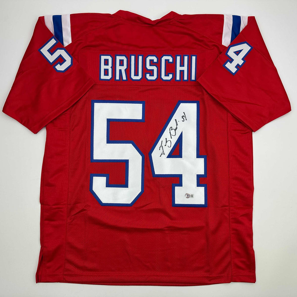 Autographed/Signed Tedy Bruschi New England Red Football Jersey Beckett BAS COA