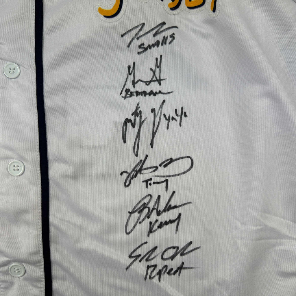 The jersey is signed by 6 members of The Sandlot cast: Marty York (Yeah Yeah McClennan), Shane Obedzinski (Tommy Repeat Timmons), Victor Dimattia (Timmy Timmons), Tom Guiry (Scott Smalls), Grant Gelt (Bertram Grover Weeks), and Brandon Adams (Kenny DeNunez) and certified by Beckett. All six actors inscribed their character names.