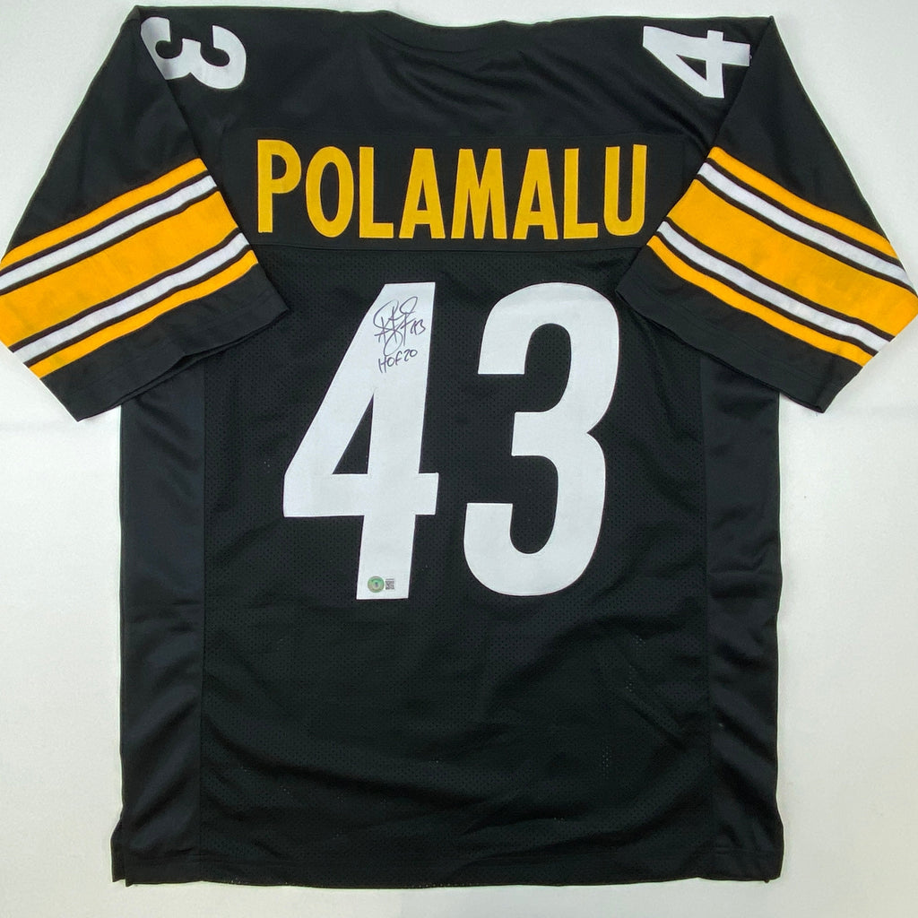 Autographed/Signed Troy Polamalu HOF 20 Pittsburgh Black Football Jersey Beckett BAS COA