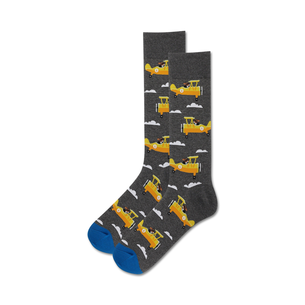 Get ready to take flight with our Aviator Pup socks! Picture this: a sky-blue backdrop, dotted with fluffy white clouds and a squadron of red airplanes. But these aren't any ordinary pilots they're adorable pups, decked out in goggles and scarves, ready to conquer the skies. These crew socks for men are a fun and quirky way to add a touch of adventure to your everyday style. So, whether you're a dog lover, an aviation enthusiast, or just someone who appreciates a good pun, slip on a pair of Aviator Pup socks and let your imagination soar!
