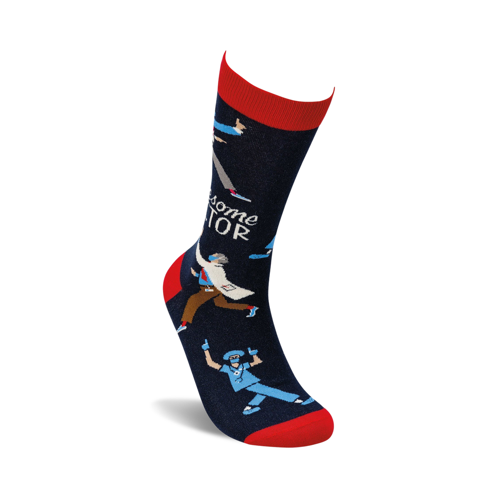 Awesome Doctor socks: Dance it off with the sassiest medics in town! These dark blue crew socks, made for both men and women, feature a vibrant pattern of cartoon doctors in white coats and surgical masks, dancing their hearts out. With the 'Awesome Doctor' text proudly displayed, these socks are sure to bring a smile to your face and spread cheer wherever you go. Step into a pair and let the dance of these medical marvels boost your spirits and remind you of the incredible resilience of the human body.