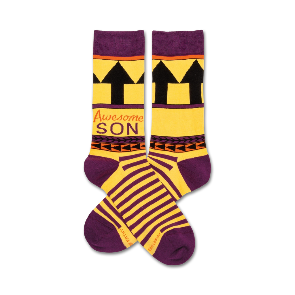 Brighten your day with these bold purple and yellow crew socks with a funky geometric pattern. With the words "Awesome Son" knitted in black, orange, and yellow across the front, these novelty socks will remind you of your awesomeness every step of the way. Perfect for everyday wear, they'll add a touch of inspiration to your day.