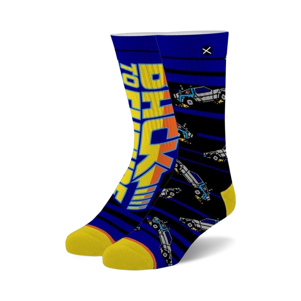 Blast back to the 80s with Marty McFly on these tub-ular crew socks! Guaranteed not to leave you hanging, these bad boys feature a sleek blue design with yellow stripes, toes, and heels, as well as a sweet set of wheels. The perfect addition to any fan's collection.