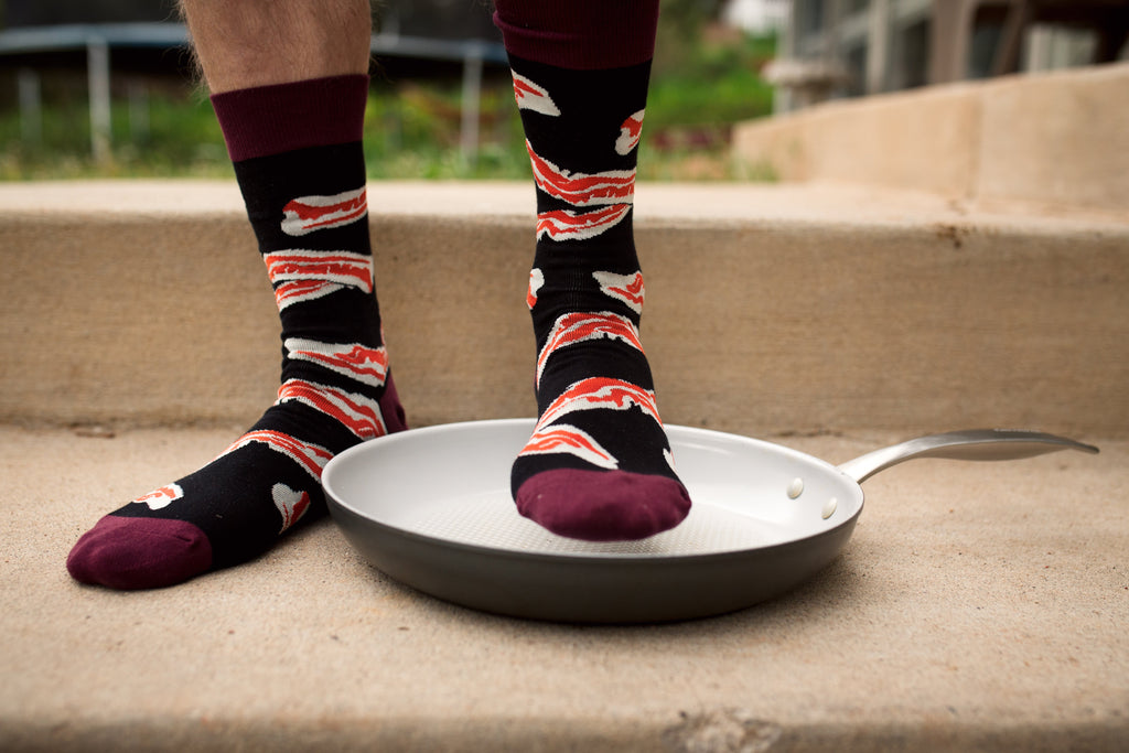 Bacon is like a national treasure to the taste buds. Goes great on sandwiches, subs, donuts, eggs, and even on socks! If you're looking for the perfect gift for your favorite foodie friend, these cool socks will not disappoint! This fun pair of bacon crew socks will show your commitment and love for this wondrous breakfast protein. Several strips of crispy goodness await your feet! Warning: These socks are not edible!