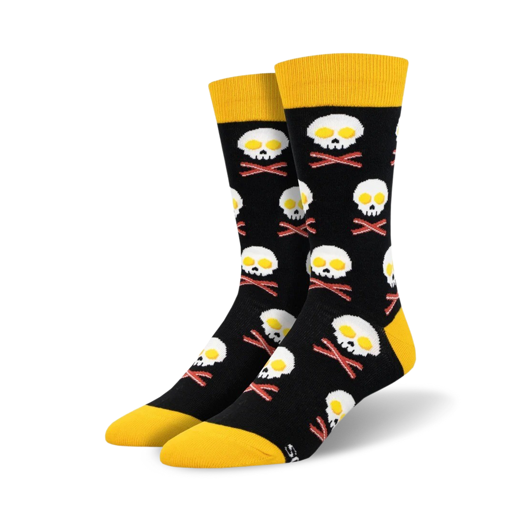 Wake up and smell the... socks? Yes, that’s right! Our “Breakfast of Champions” crew socks are here to add a dash of rebellious flair to your morning routine. Cloaked in a sleek black, these socks feature a daring pattern of eggs and bacon—not your ordinary breakfast, though. These aren’t just any eggs; they’re eggs with attitude, shaped like skulls. And the bacon? It’s crossed like crossbones, warning anyone who dares to challenge your impeccable taste in foot fashion. With sunny yellow accents on the toes, heels, and tops, these socks are far from your average foot coverings. They’re a feast for your feet, a true declaration of your bold style and a cheeky nod to starting your day on the right—or left—foot. Perfect for those who like their fashion served with a side of edge. So, why settle for plain when you can strut in style with a pair that’s as unique as your breakfast preference?