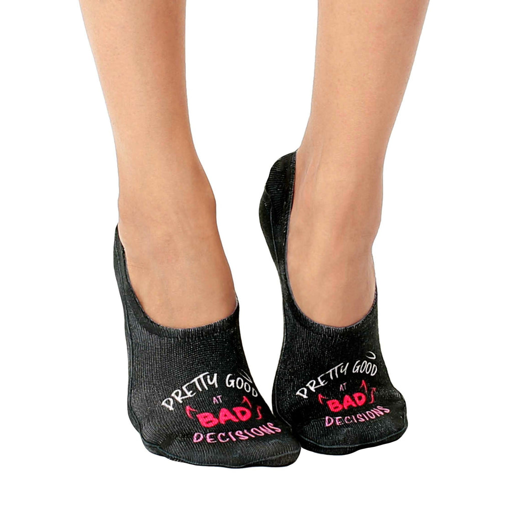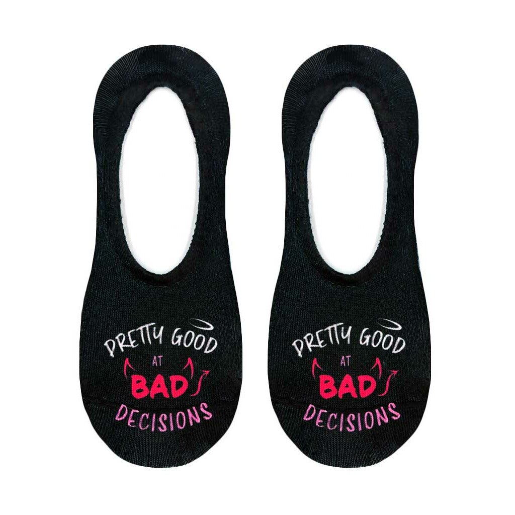 Bad Decisions socks are the perfect way to add a touch of fun and humor to your everyday style. These black liner socks for women feature the phrase "Pretty Good at Bad Decisions" in pink and white lettering, reminding you to embrace your wild side and live life to the fullest. Our silly socks are also a great conversation starter. Want to know a fun fact? Did you know that in the 18th century, pink was considered a masculine color and blue was feminine? Crazy, right? So, wear these wild and crazy socks and make a statement in any situation!