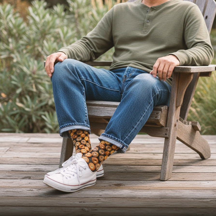 Get ready to add some flavor to your feet with our "Bagels 360" socks! With these socks on, you'll be the bagel boss of breakfast fashion. These unisex crew socks feature a mouthwatering all-over pattern of plain, sesame, poppy seed, and everything bagels. Show off your love for these doughy delights and start your day off with a smile.