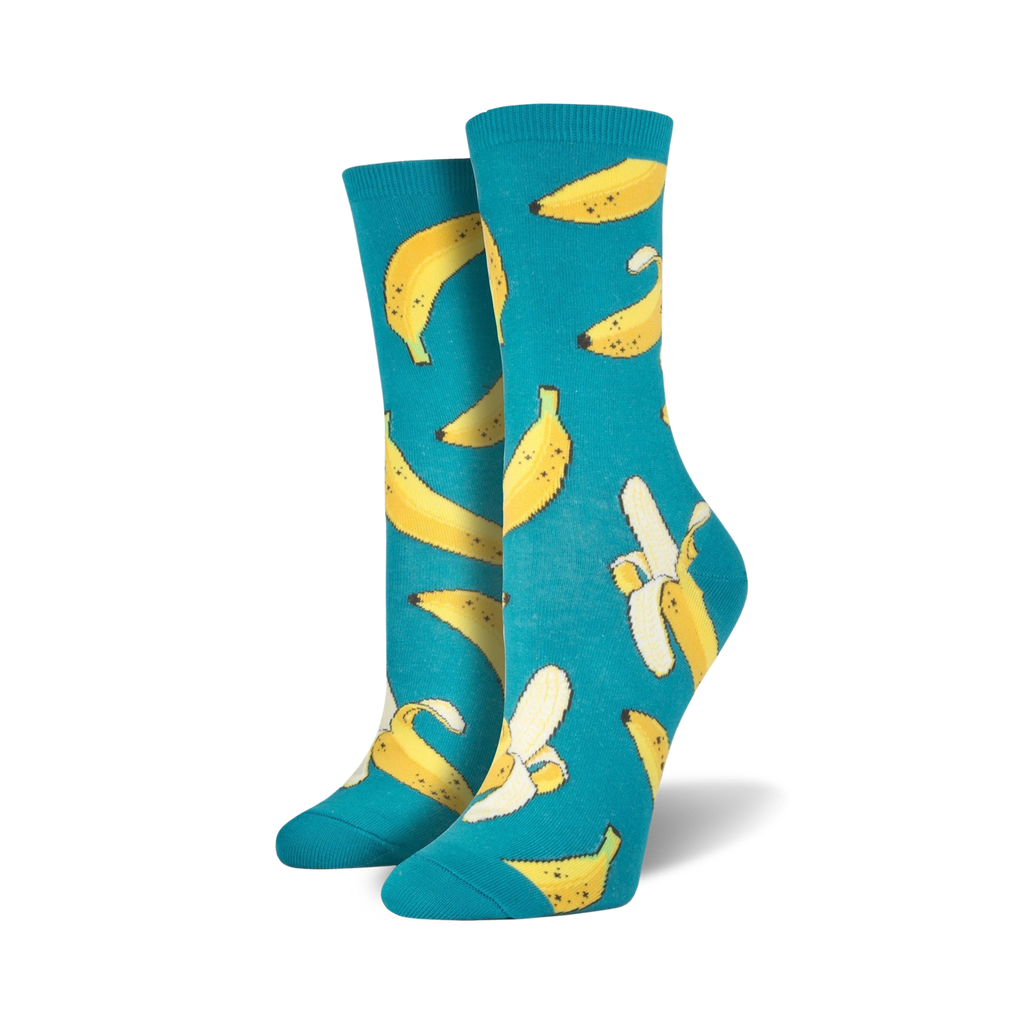 You'll go bananas over these crazy, cool socks. If you love America's favorite fruit as much as everyone else does, these funny women's novelty crew socks will have you feeling extra fruity! Each awesome pair features yellow bananas-peeled and unpeeled- printed all over on an eye-pleasing teal background. Get these cool socks now- you're feet will thank you for all the extra potassium.