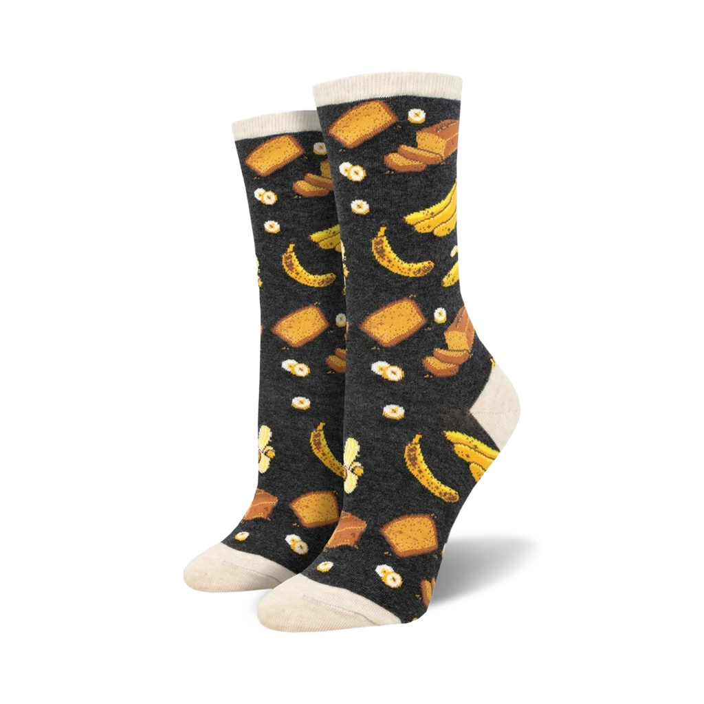 Alert! Calling all bread-heads! Kick your feet up in these cute black socks with a pattern of cartoonish slices of banana and bread. Show off your love for breakfast in a quirky way, and don your Banana Bread socks whether you're brunching or taking a bite out of the big apple.