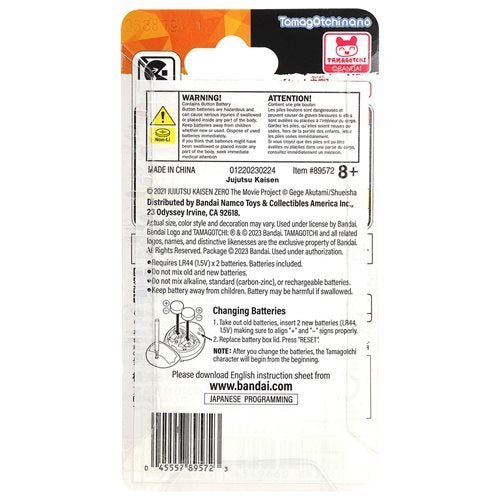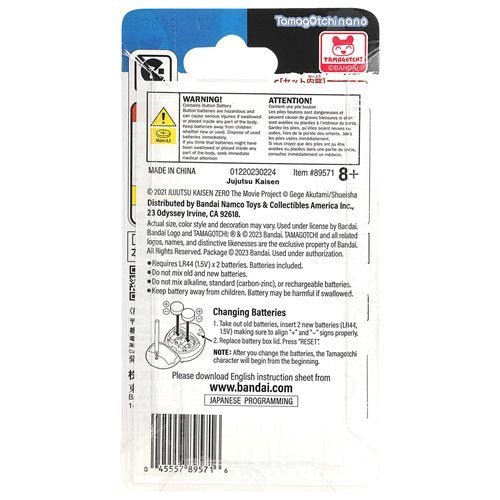 Fight curses and train sorcerers from Jujutsu Kaisen 0: The Movie. This Tamagotchi Nano features a shell designed to look like Gojo's eye wrappings and cursed energy! Feed your character when hungry, give them a snack when they are in a bad mood, and play three different mini-games. Your play pattern will determine which of the 13 characters Satoru Gojo will introduce you to. If you neglect your characters, they will leave. The Jujutsu Kaisen 0 Satoru Gojo Tamagotchi Nano Digital Pet measures about 1 1/2-inches tall x 1 1/5-inches wide x 1-inch long. Requires 2x "LR44" batteries, which come included. Ages 8 and up.