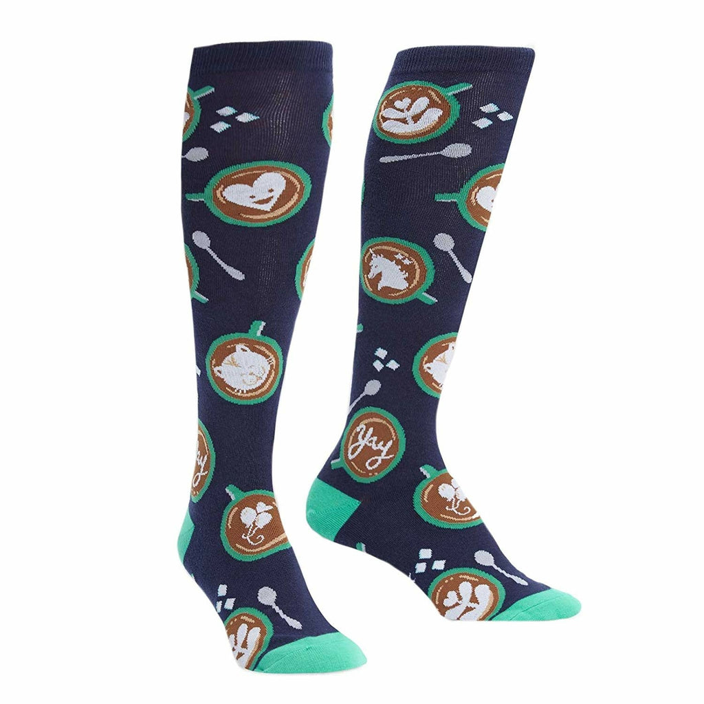 These knee-high socks are a dark navy blue, and feature a whimsical pattern. The visible design includes several latte art designs in shades of brown and white- think hearts, horses, and cats- nestled within the cups. Small teal spoons and sugar cubes are scattered throughout. The word 'Yay' is also shown on at least one sock. The socks have a teal cuff at the bottom.