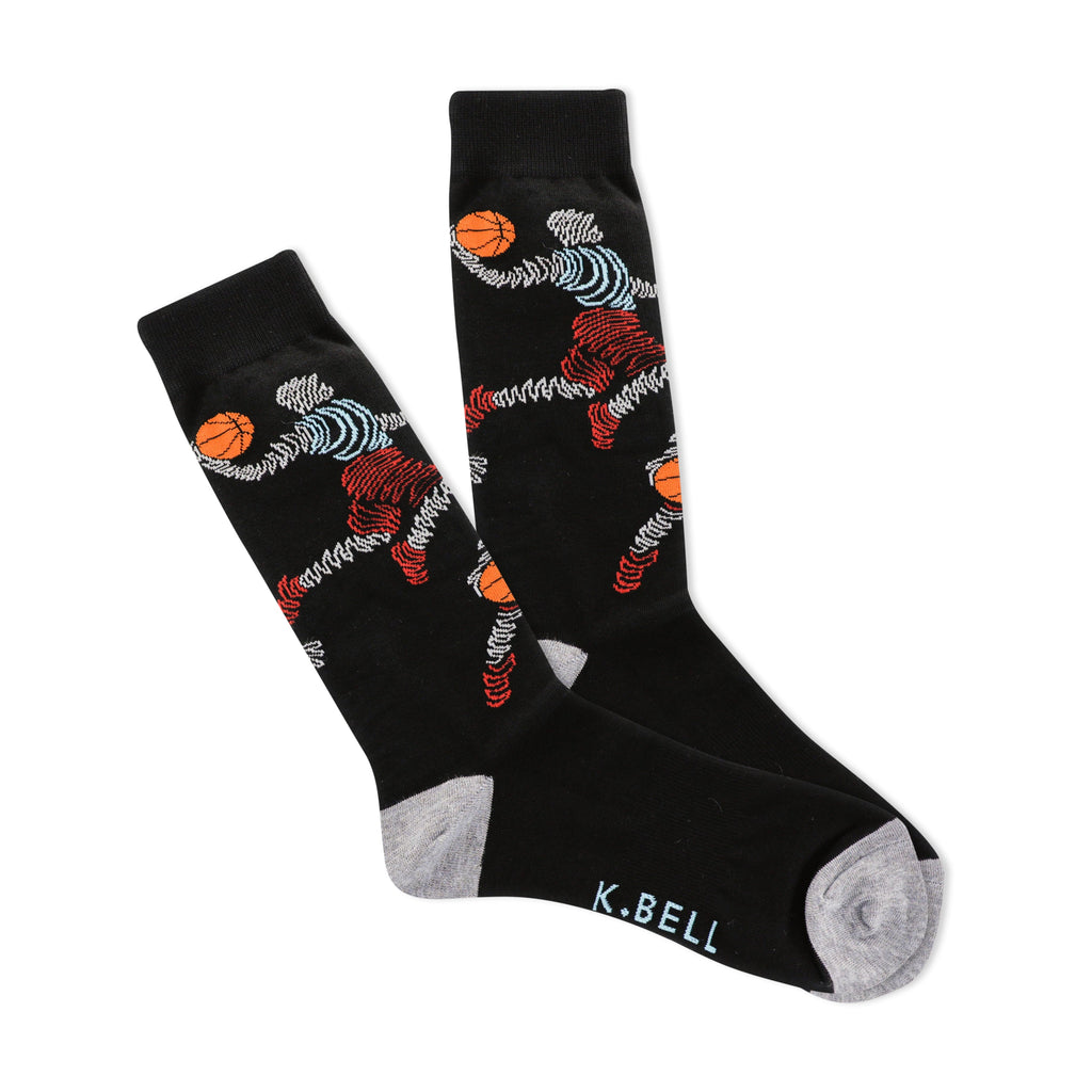 These Basketball Zigzag socks are pretty sweet. They're mainly black with a cool pattern: stylized basketball players in red, orange, and light blue, shown in a zigzag arrangement. The players look like they're made of interwoven lines-it's a neat effect. The socks have a grey cuff at the bottom, and a small label is visible at the heel. They're crew socks- a comfortable length for everyday wear.