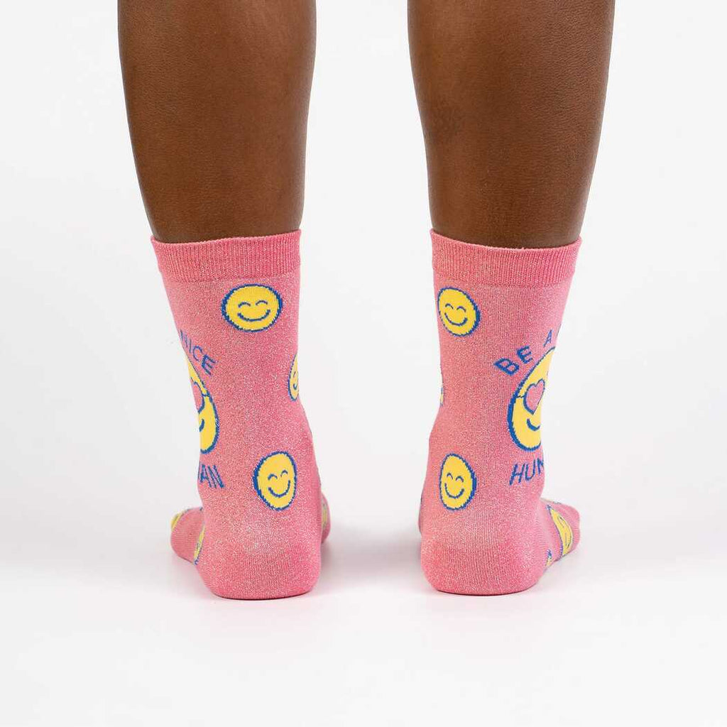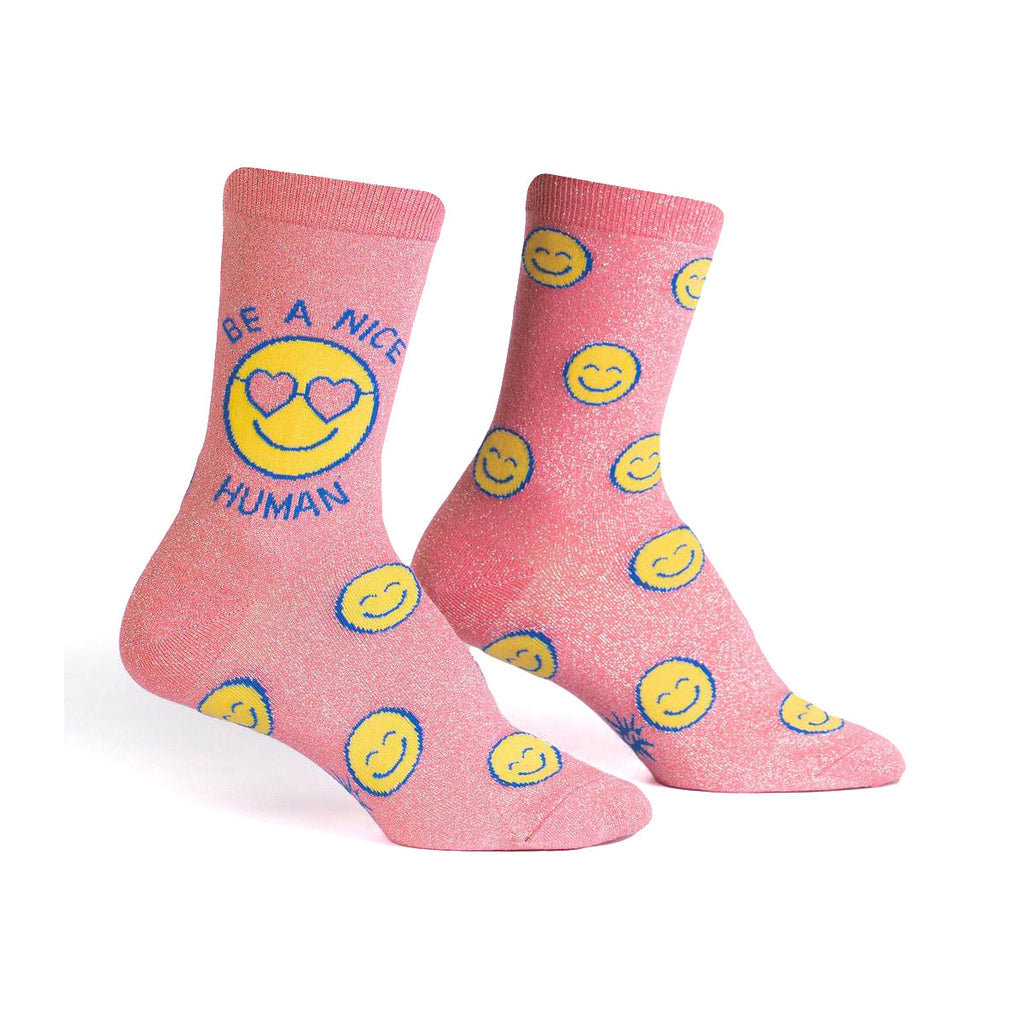 Spread the good vibes with our 'Be a Nice Human' socks! These crew socks are a sparkly pink with a subtle glitter finish. The visible portion shows a repeating pattern of smiling faces. One sock features a larger graphic: a smiley face wearing heart-shaped sunglasses, accompanied by the phrase 'Be a Nice Human'. They're comfy, cheerful, and a little bit sparkly - perfect for adding a touch of fun to your everyday outfit.