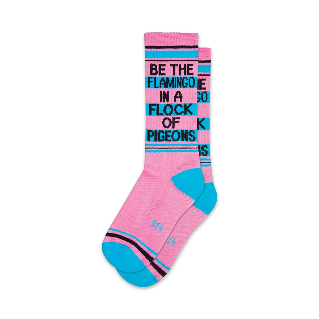 Hey, want to know the secret to standing out without peacocking? Try our flamingo socks! They're a burst of pink with blue toes and heels that scream, "Look at me!!" You'll be the flamingo in a flock of pigeons! There's even a subtle message stitched on the side: "Be the flamingo in a flock of pigeons." These socks are made for men and women who are ready to embrace their vibrant side. They're XL crew length, so they'll keep your ankles warm while you strut your stuff.