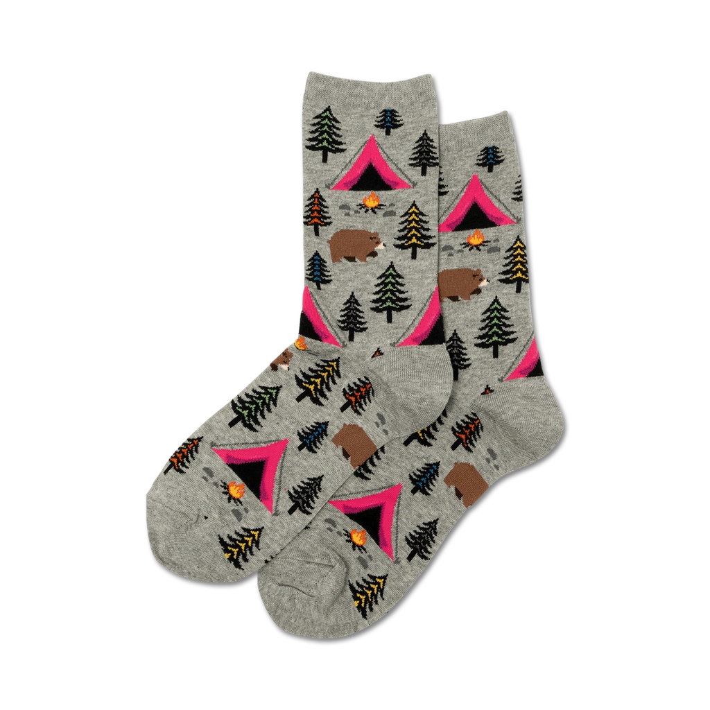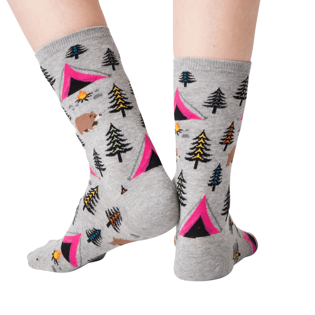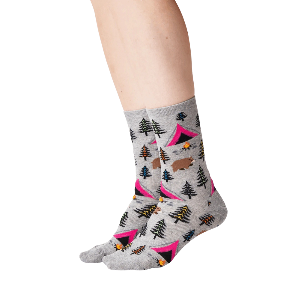 Calling all campers, adventure seekers, and bear enthusiasts! Say hello to our Bear Tent socks, the perfect accessory for your next outdoor adventure. These crew-length socks for women feature a whimsical pattern of cartoon bears, blue and brown tents, green pine trees, and a roaring campfire. Get ready to pitch a tent, roast marshmallows, and make memories that will last a lifetime ”all while keeping your feet cozy and stylish.
