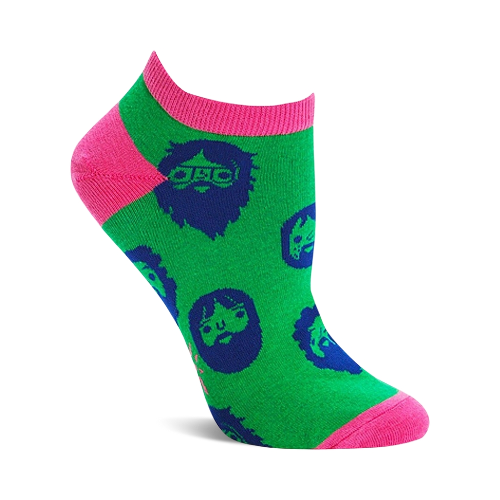 Has the thought of facial hair grown on you? Do you find the hairy look attractive and full of strength? Show off your love for the manliest of beards with these quirky ankle socks. Each cool pair comes in neon pink and green with several small bearded male faces in blue. Let your no-shave November support be shown all year round with these funny socks.