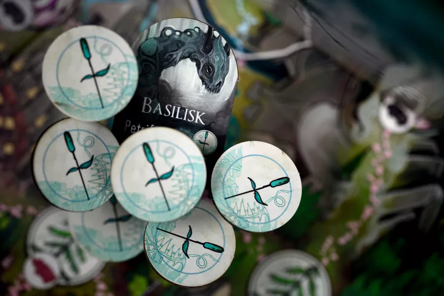 The Beast uses a deck of direction cards to move over forests, swamps and caverns, using guile and deceit to hide its track from the hunters. However, whenever a hunter moves over a location where the Beast has previously been, a trail appears. Only when a hunter searches a location or the Beast itself attacks an unsuspecting target is the Beast's actual position revealed. More so, each hunter has but one chance of searching each round, making it a tense and difficult decision. Hunters seldom have full information whether the trail they’re pursuing contains the Beast’s actual location, or if the trail has already gone cold.