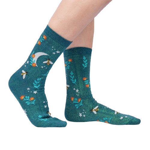 Meet Bee Dazzling Shimmer socks! Picture a dark teal canvas buzzing with a flurry of yellow and black striped bees gathering nectar from orange, pink, and white flowers under a crescent moonlit sky filled with twinkling stars. These crew length socks for women have a ribbed top and fortified toe and heel. Like a bee's resilience, these socks will last and dazzle!