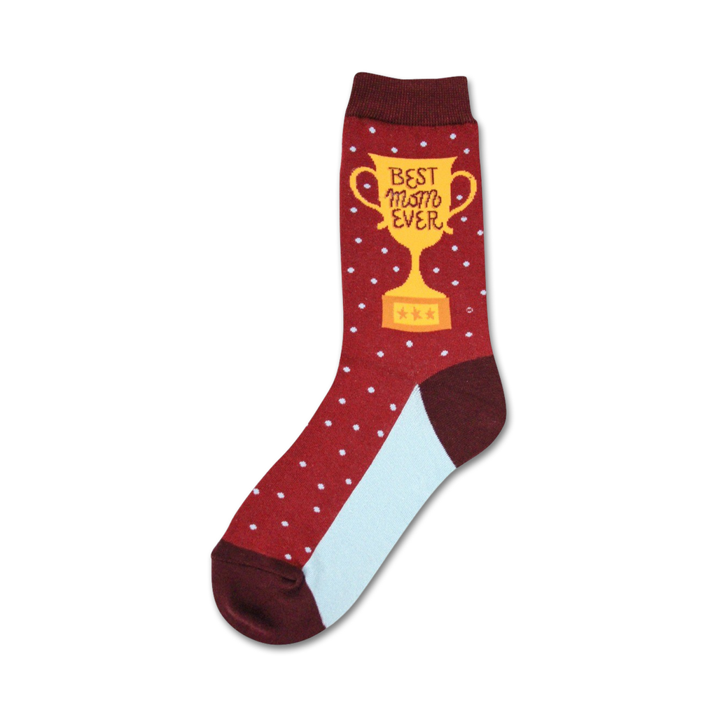 Show mom she's the best with these comfy crew socks that come with a lovely compliment. With the words "Best Mom Ever" spelled out in big bold letters against a red sock with white polka dots, she'll know you think she's number one. Take a chance on one of our best sellers and show Mom your love. Mom's smiles per hour guaranteed to go up after opening this adorable gift.
