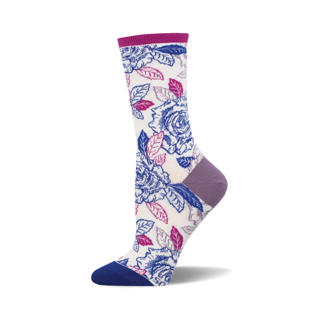 These socks feature a captivating design of blue illustrated roses paired with boldly unconventional dark pink leaves. But it doesn’t stop there; each pair boasts a vibrant blue toe, stylish grey heels, and a classic white background that makes the floral pattern truly pop. Perfect for those who appreciate a dash of daring with their dapper, "Bi Roses" socks are more than just a comfy fit—they're a conversation starter. Slip into a pair, and let your feet bloom with every step!