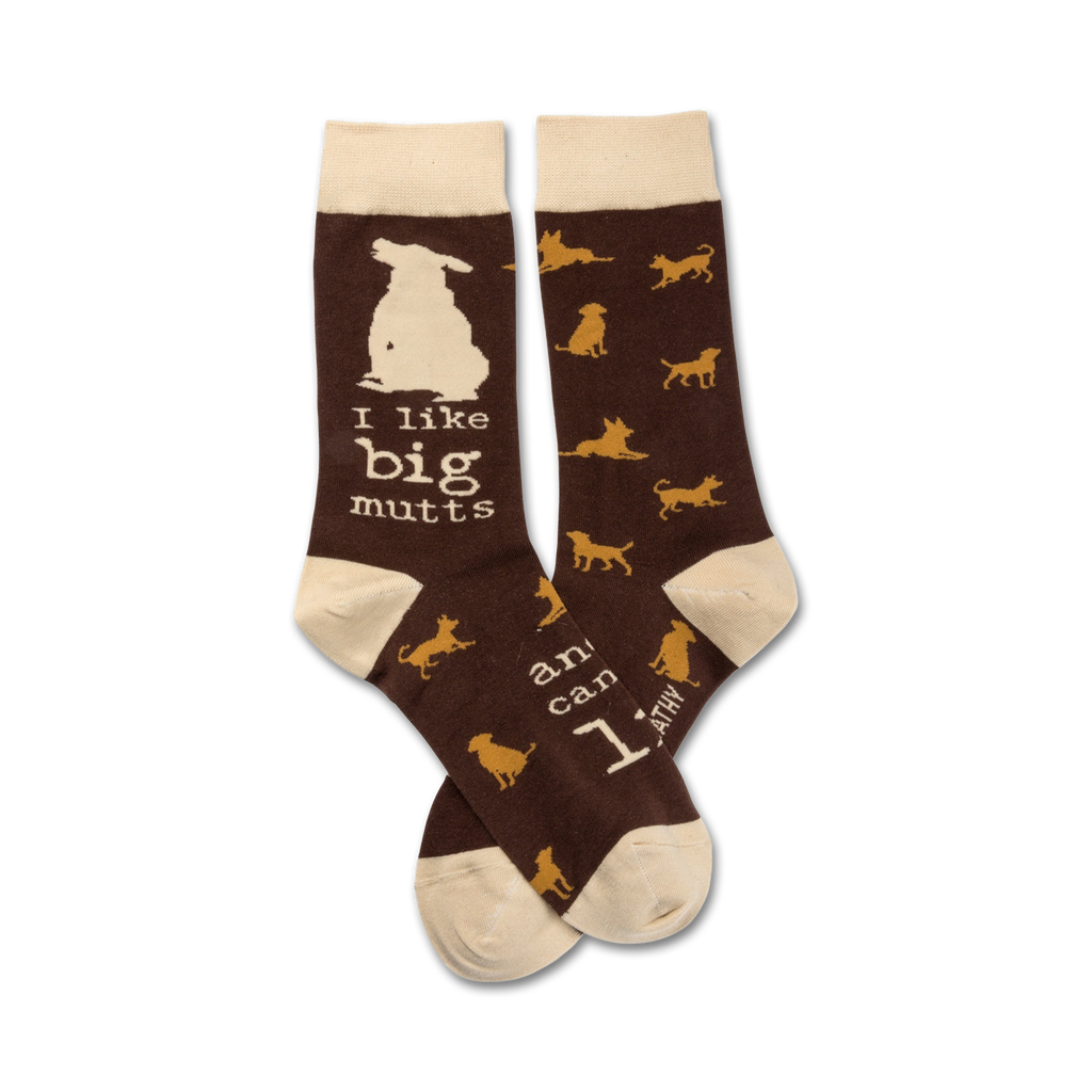 Say hello to your new favorite conversation starters: our brown and beige dog print socks! With a playful nod to a classic jam, "I Like Big Mutts and I Cannot Lie" splashed across your feet, these socks are perfect for anyone who's crazy about canines. They're not just socks; they're a declaration of your pup passion, a way to bring a little wag to your walk and a bark to your banter. Ideal for all the dog moms and dads out there, they're sure to fetch compliments and smiles wherever you go.