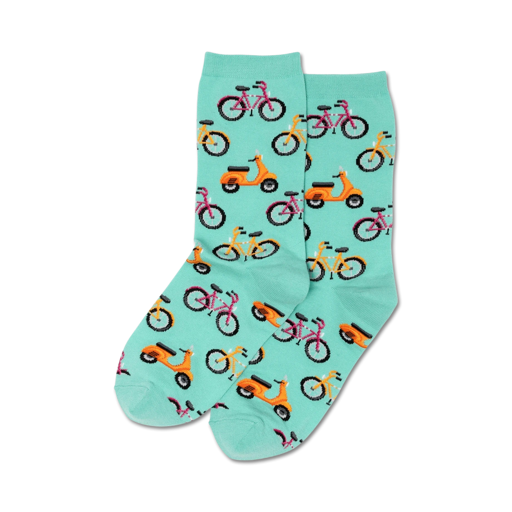 Two-wheeling through life in style with our Bike and Vespa Crew Socks for women! These socks have a pattern of orange and pink bicycles and yellow scooters on a cool mint green background. Pedal your way through the fashion world with a reminder that life can be a smooth ride. And remember, if you ever feel like you're stuck in a rut, just look down at your socks and remember that there's always a new adventure waiting for you, just around the bend!