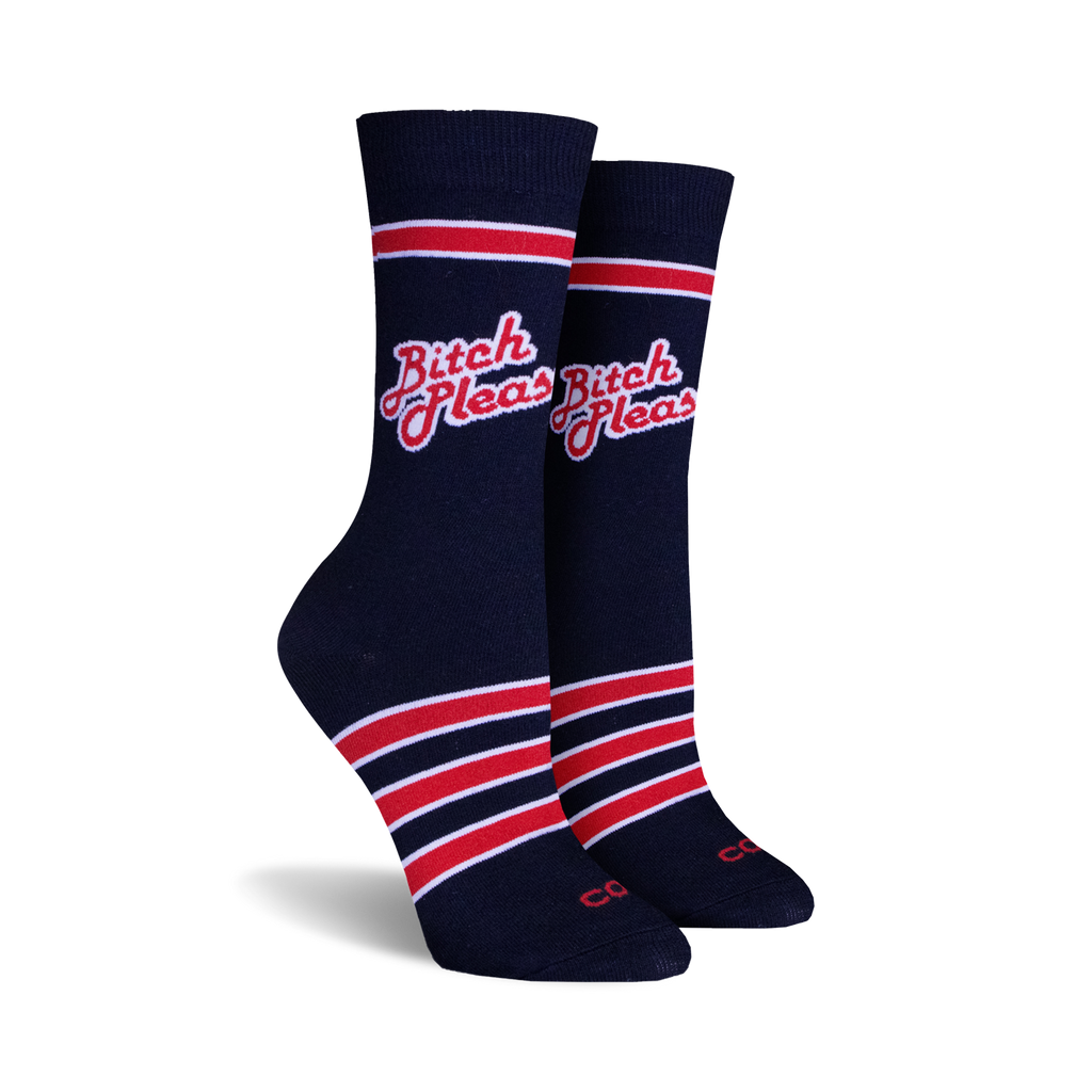 Bitch, please. You can't wear just any old socks, you need socks that make a statement. These sassy socks are made for the bold and fabulous. With their dark blue background, red and white striped accents, and "Bitch Please" emblazoned across the front, these socks demand attention. Grab a pair and show the world who's boss.