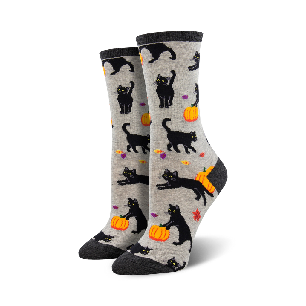 These gray crew socks will make you "fall" for Halloween with their adorable black cats, pumpkins, and leaves in bright orange, yellow, and green. Your feet will never feel bored again!