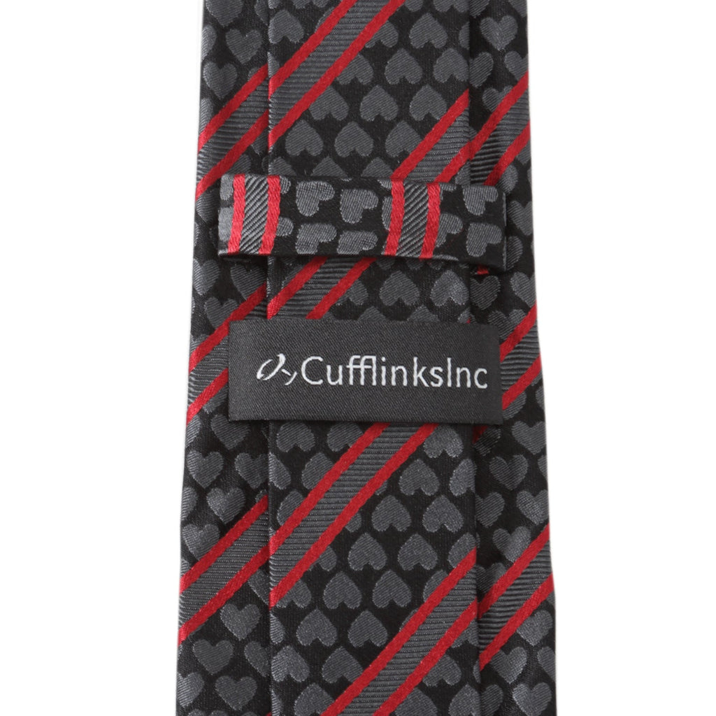 If bright pink heart balloons and giant stuffed teddy bears aren't your thing, celebrate Valentine's Day in your own way with this refined black and red 100% silk tie. Rows of gray hearts sit in contrast to ribbon stripes of ruby red and a pure black background, making this the necktie equivalent of a single elegant red rose.