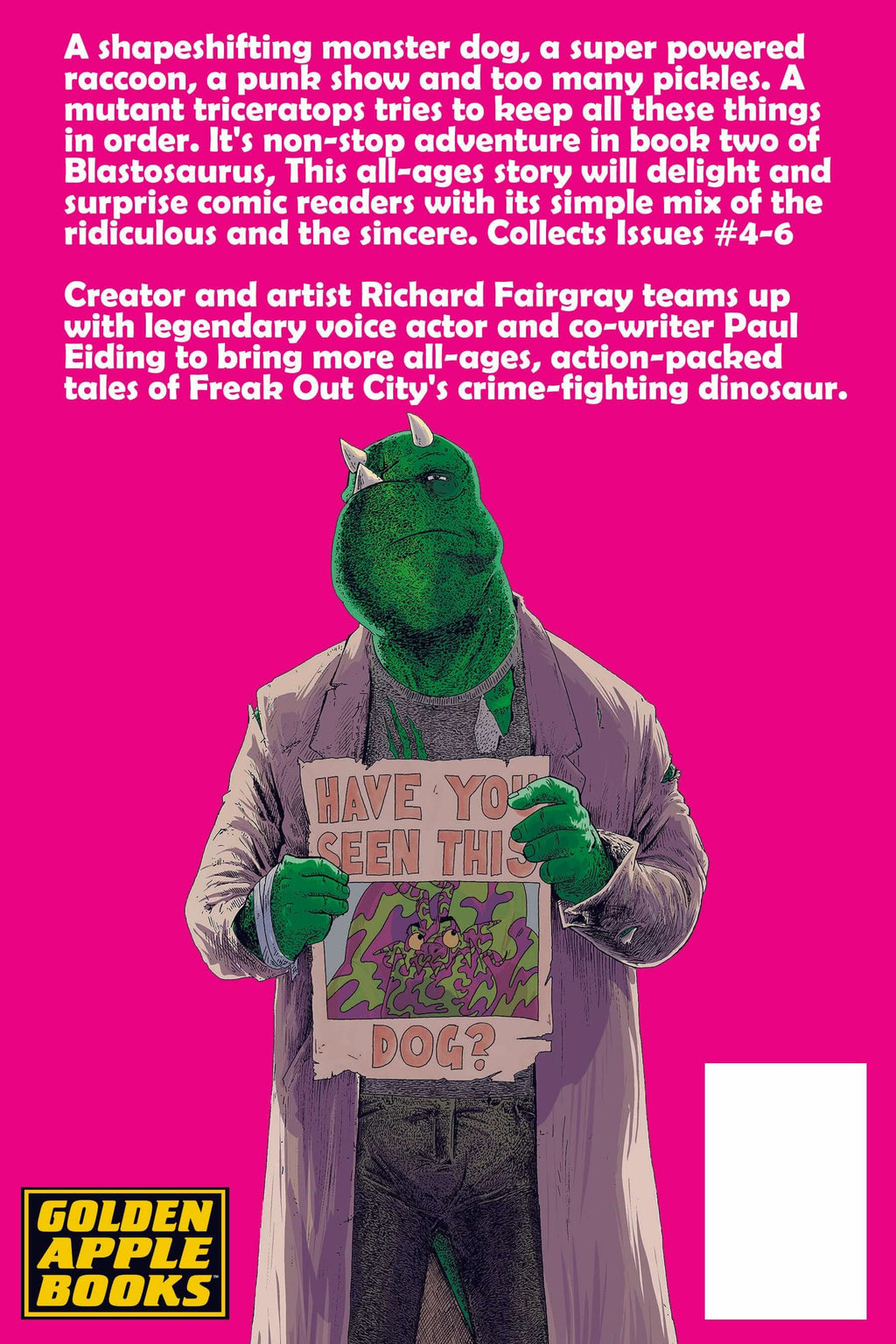 A shapeshifting monster dog- a super powered raccoon- a punk show and too many pickles. A mutant triceratops try's to keep all these things in order. It's a big night in Freak Out City when Merle the miniature schnauzer loses the magic collar that stops him transforming (at random) into a giant glowing monster from another dimension. Now he's on the loose and on a rampage trying to track down the raccoon who stole it. Richard feels responsible because (of course) it's his fault the raccoon got the thing in the first place- so he (and Merle's elderly owner Doyle) go to our hero for help. Collects issues #4-6 of the series.