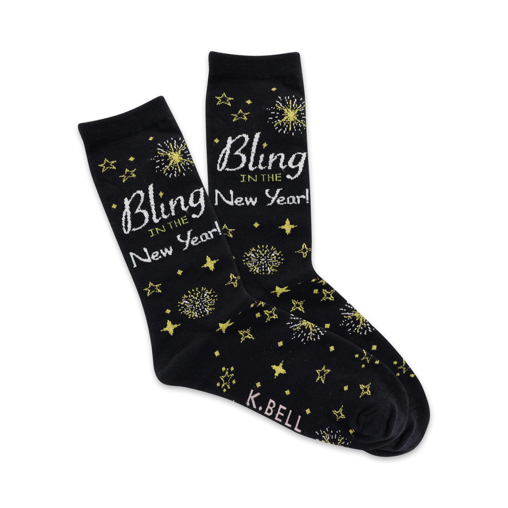 Beam into 2023 with our "Bling in the New Year" socks! These dazzling black socks, designed with a constellation of gold stars and sparkling fireworks, will make your feet the talk of the party. The vertical lettering on each sock reads "Bling in the New Year" in brilliant gold, serving as a constant reminder to step into the new year with style and sparkle. Step up your sock game and welcome the new year with a bang - literally!*