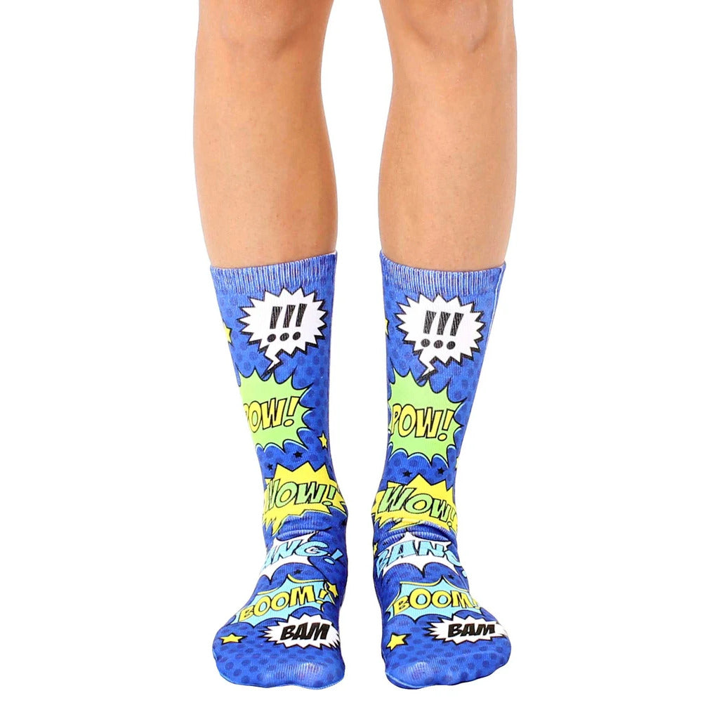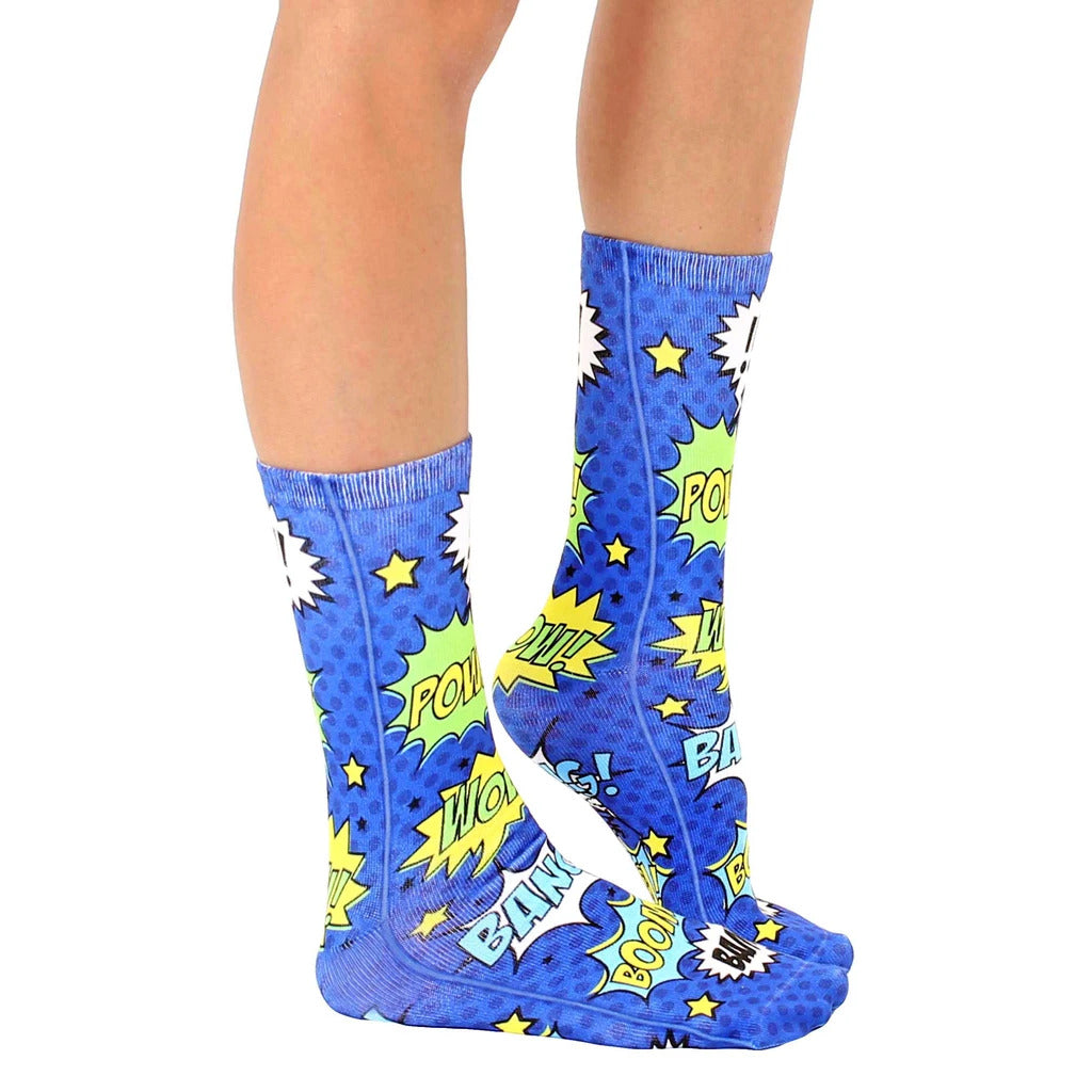 Blam! Pow! Boom! Turn your feet into a comic book with these Blue Comic Crew Socks. Their vibrant blue with speech bubble accents will give you super sock style. Show your superhero spirit by wearing these comic book-inspired socks! They're perfect for both men and women, so you can share the sock love.